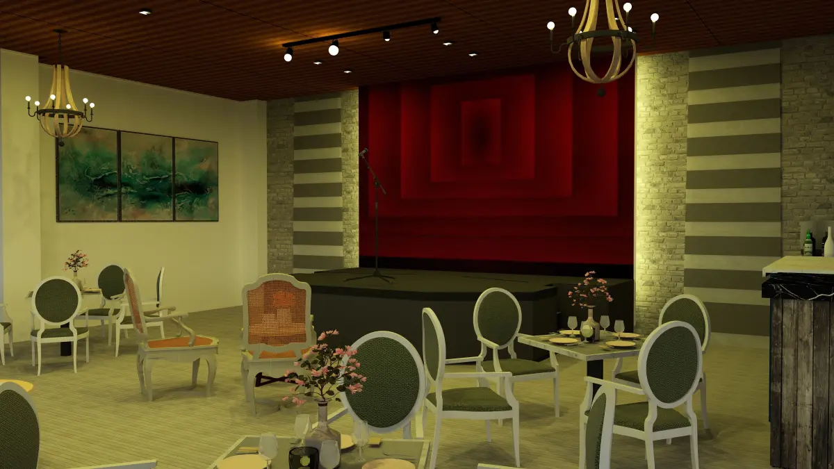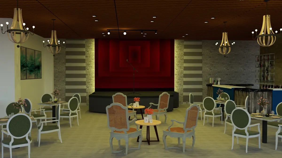 This is a model of a restaurant, which is based on a Mediterranean theme. It has full lighting and material wrapping and also the renders of day view and late evening views from different angles. It has detailed furniture seating with a bar and a stage for artists to perform on.