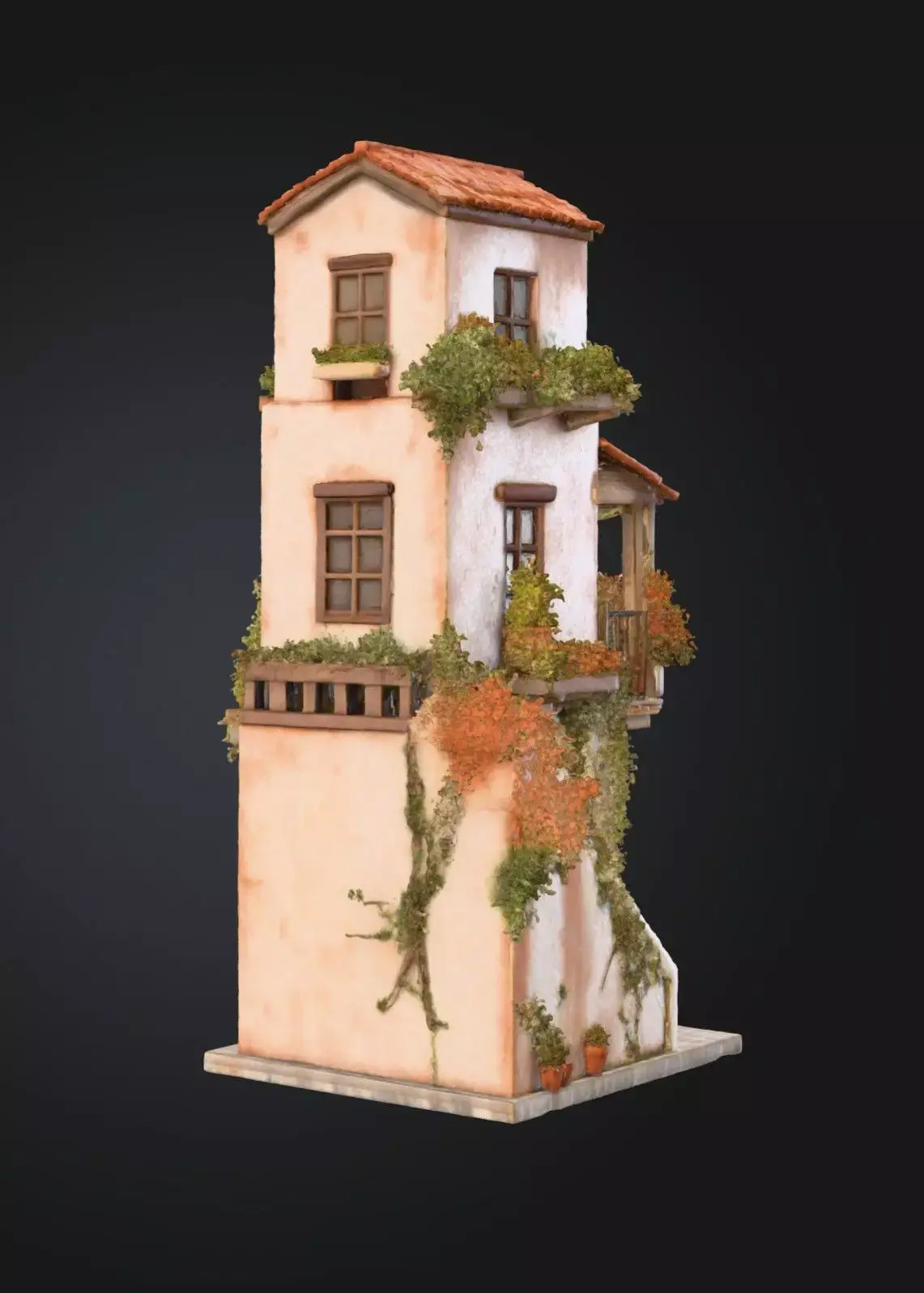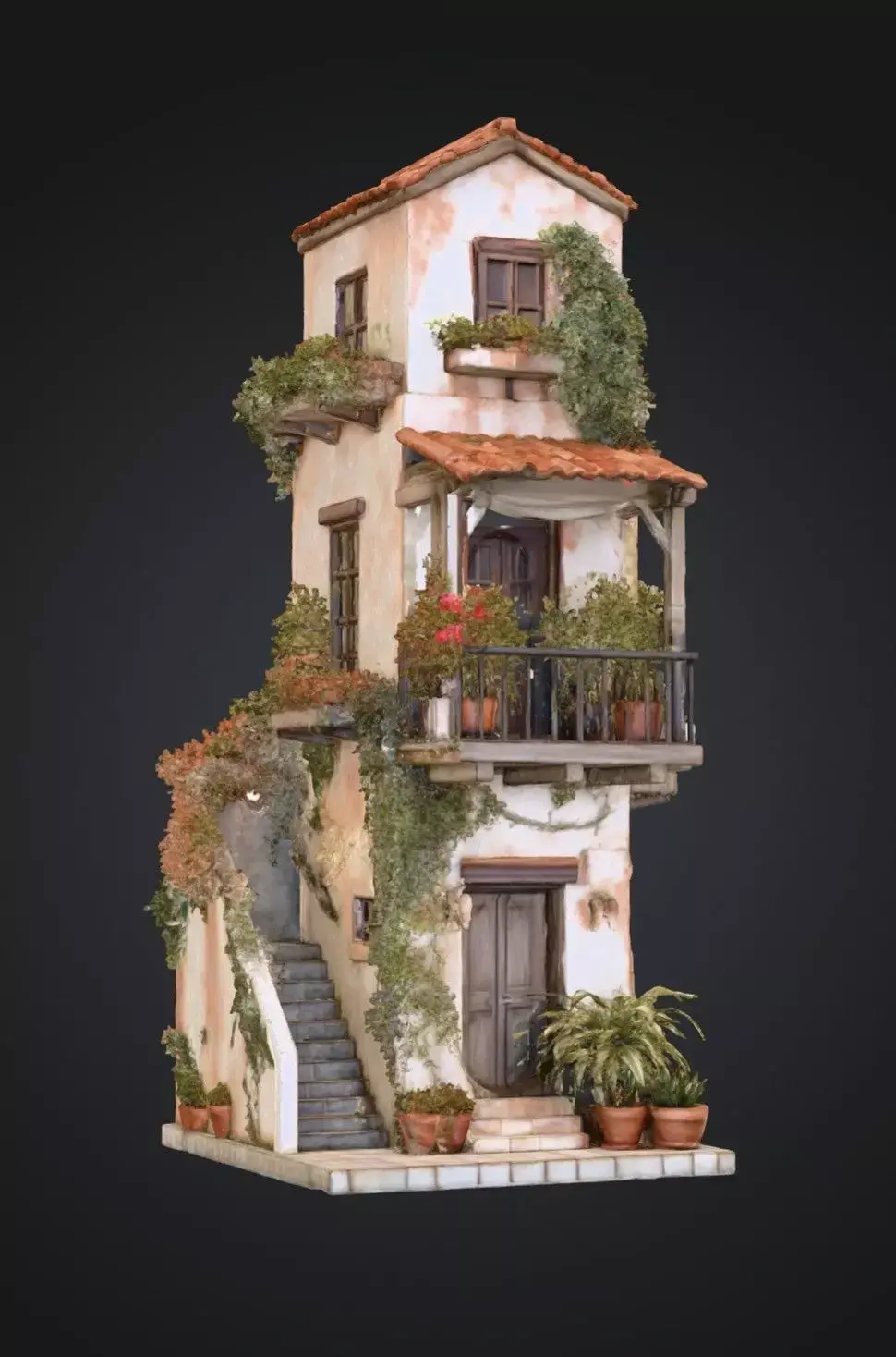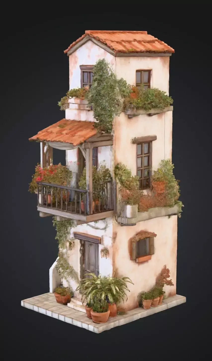 Charming Mediterranean‑style two‑story house featuring terracotta roof tiles, wooden balcony, stone staircase, and lush potted plants with ivy. Ideal for 3D scenes, games, or animations requiring warm rustic architecture. Comes as a clean low‑poly or mid‑poly mesh with PBR textures, optimized for Unreal Engine, Unity, and Blender.