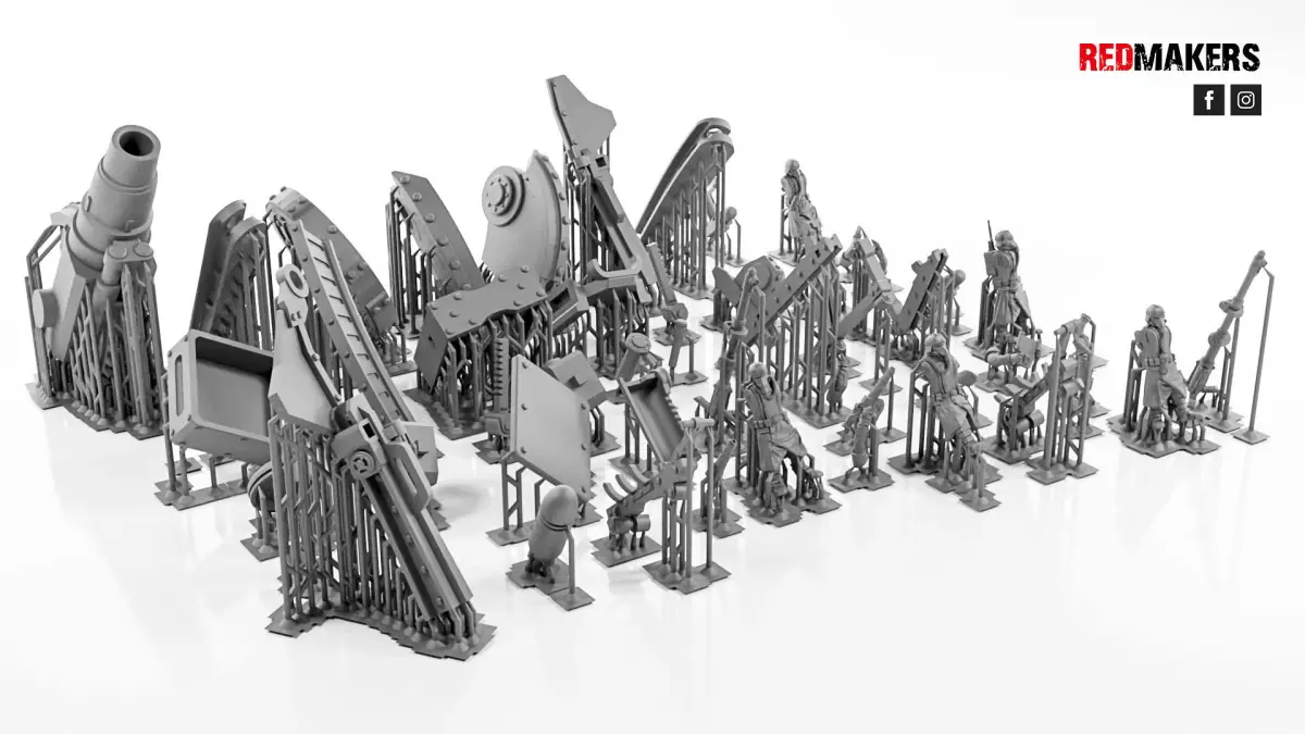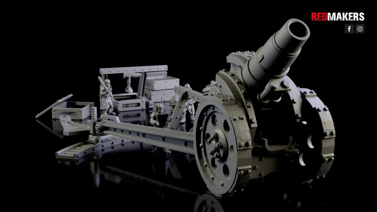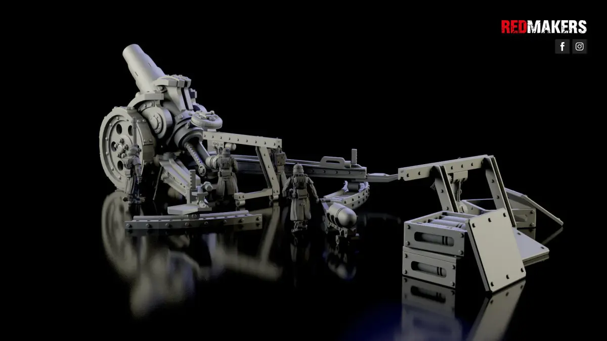The heavy cannon consists of 21 parts. Also, in the package there are 5 gunners and other decorations. Scaled for 28 mm tabletop.
