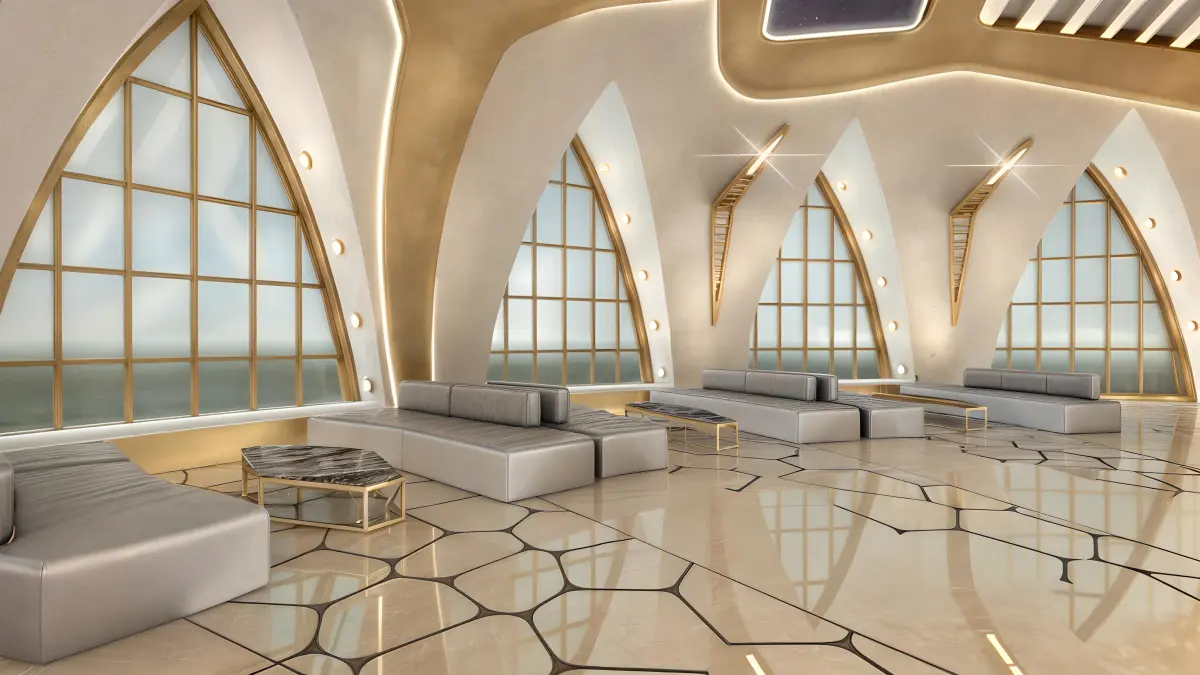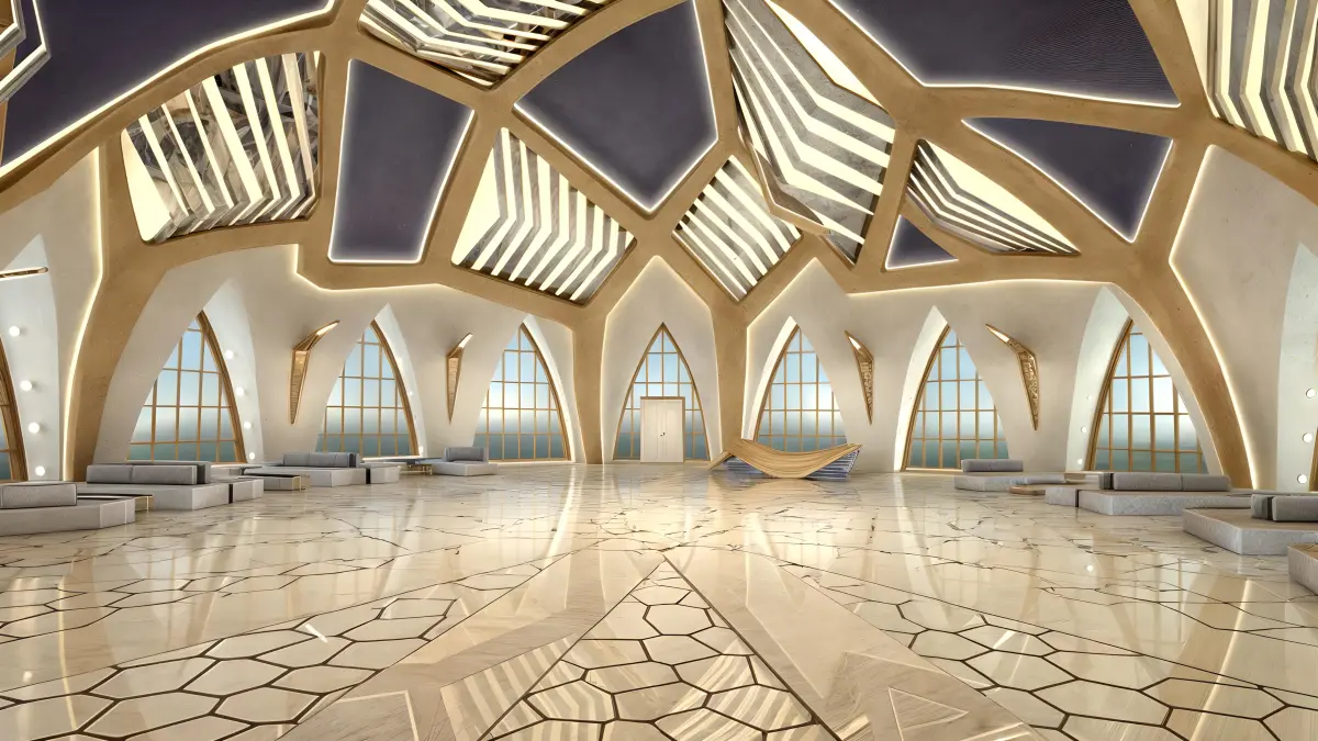 Architectural DescriptionThis entrance hall of a meeting center reflects a futuristic elegance, shaped by modern interpretations of traditional forms. The main design elements come together in a spacious and high-ceilinged area, emphasizing light and openness. The large, arched windows allow maximum natural light to enter while creating a visual connection between the interior and the exterior landscape. The color palette, consisting of gold and beige tones, creates a sense of warmth and luxury.
