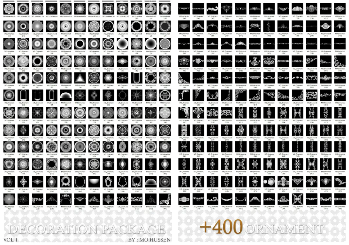 Ornamental objects - interior decoration - Exterior decoration- Furniture- Architecture and design of columns and structures- equipment -characters - Luxury - Royal - Floral - Vintage - Damask - Ethnic - Classic (Ancient) - Calligraphic - Fantasy - Swirly - Geometric - Holy Feasts (Halloween and Christmas) - Asian - Arrows - Gemstones (Diamonds) and Wedding