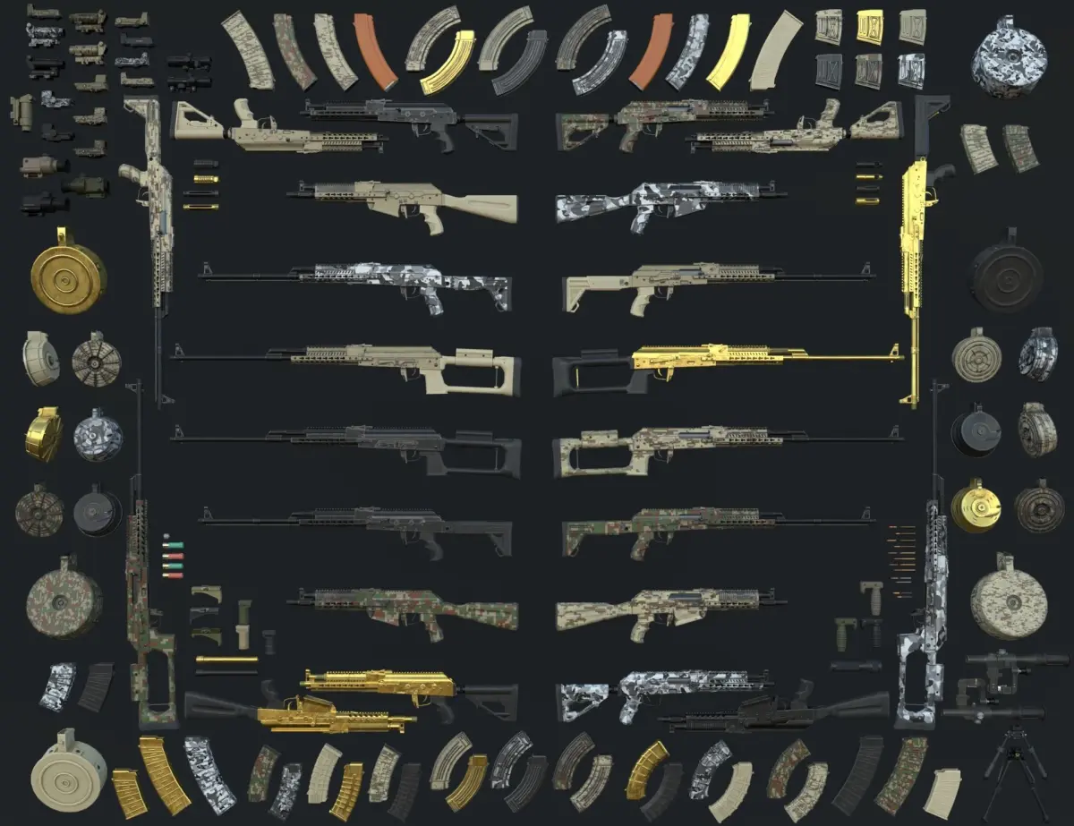 AK Steel Magazines: 30rd mag (7.62x39mm); 40rd mag (7.62x39mm); 75rd mag (7.62x39mm). (Black; Tan; Gold; Digitan; Digicam; Snow) (30rd 762: Tris: 5,268; Verts: 3,013) (40rd 545: Tris: 5,680; Verts: 3,251) (75rd 762: Tris: 3,693; Verts: 2,030) (2K)