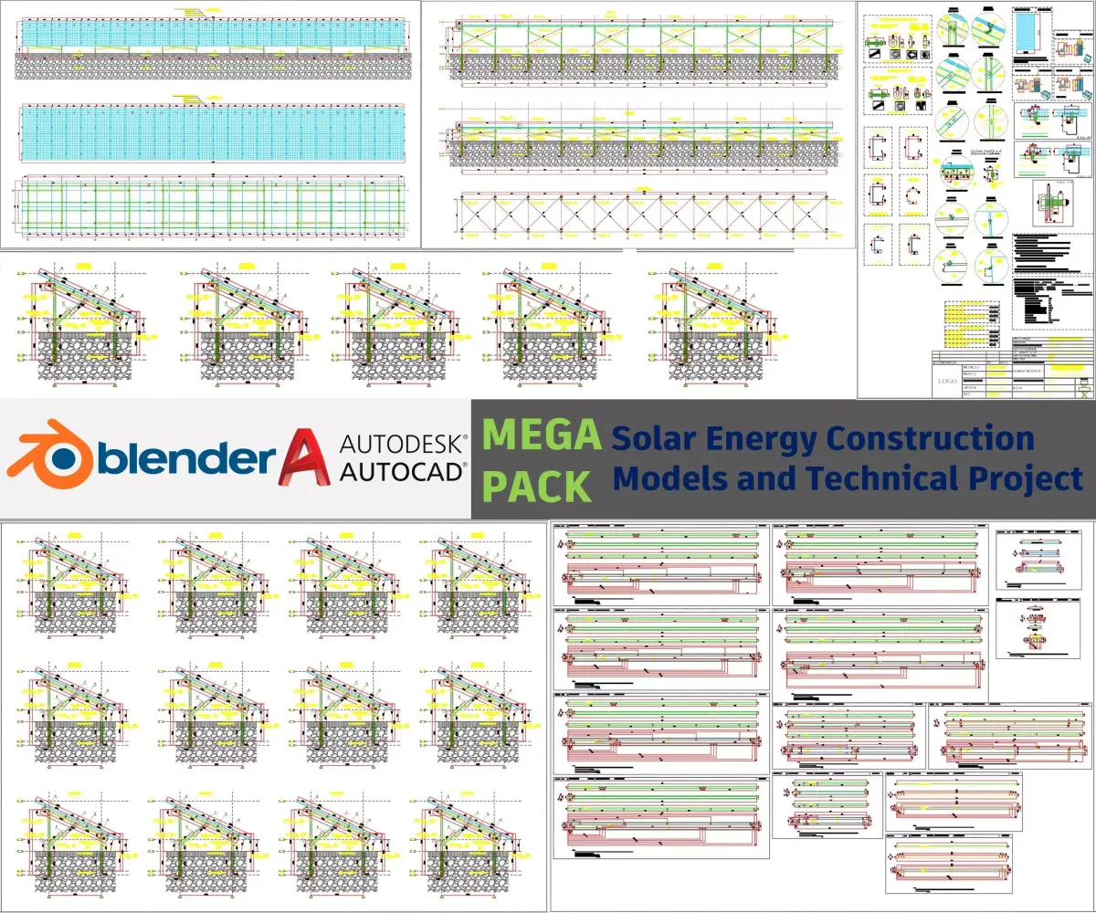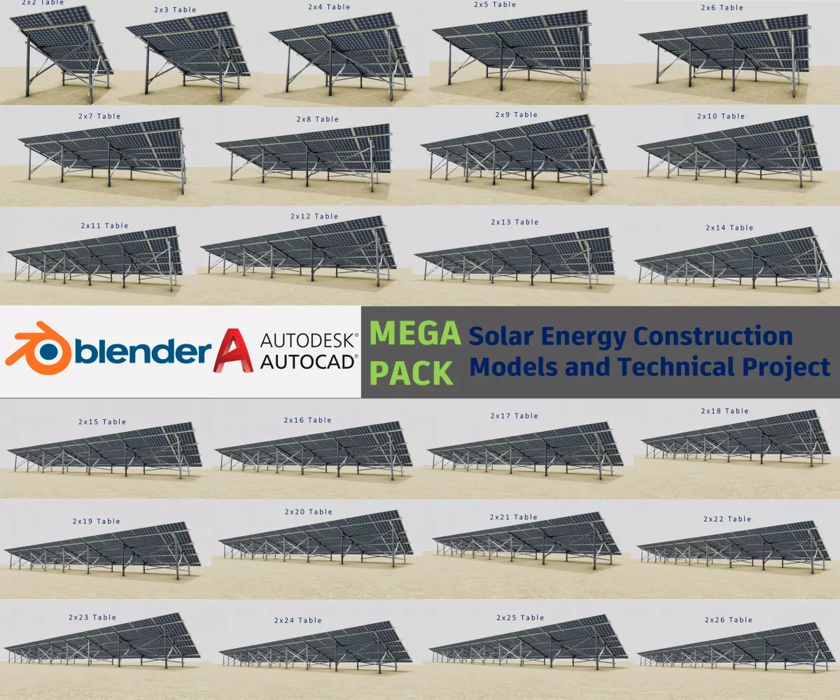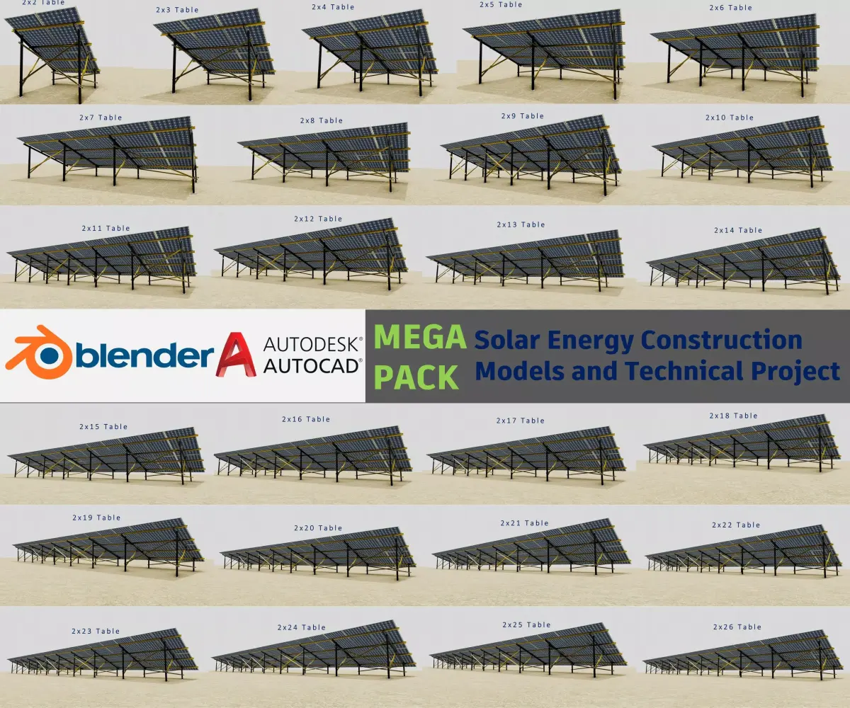 Mega Pack Solar Energy Construction Models and Technical ProjectsA complete set of mounting rack models covering all panel configurations from 2x2 to 2x26, designed for professional solar energy systems!This package includes 3D models prepared with Blender and AutoCAD technical/manufacturing projects.You can use them as a reference for your real projects and directly in simulations or visual presentations.Package contents:- Ready 3D models in Blender (.blend) format, 25 different models. Galvanized, Black, and Gold coating options.