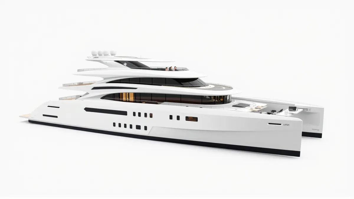 This ultra-futuristic Mega Trimaran Yacht model features a triple-hull structure, high-speed hydrofoil enhancements, extended luxury balconies, and an oceanfront infinity deck with retractable sunroofs. It is ideal for cinematic visualizations, luxury marine simulations, and high-end interactive project scenarios.
