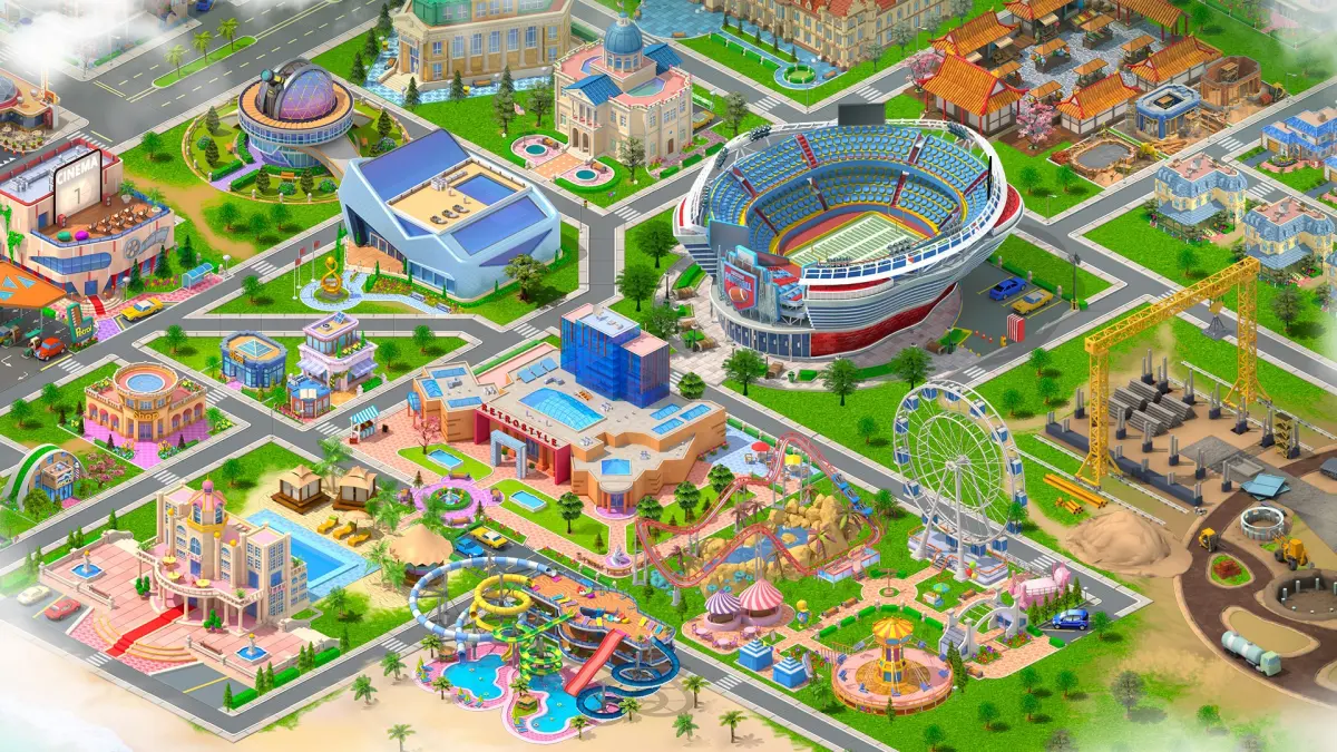 The city we built has close to 43 unique buildings and included ordinary buildings, such as a cafe, a church, and an airport, and more interesting industrial sites, such as a power station, a television tower (our beauty), a spaceship launch site, etc.