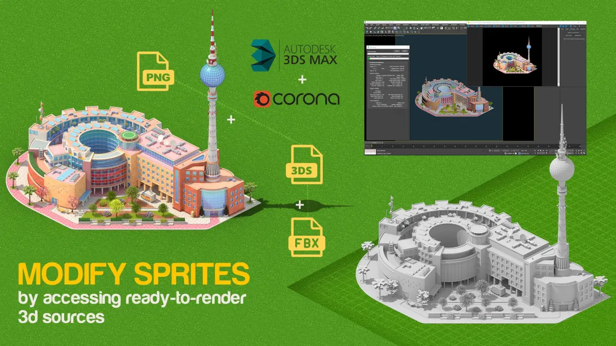 - Well organized and ready to render 3ds max scenes with fully customized Corona Renderer 7 materials applied on each building