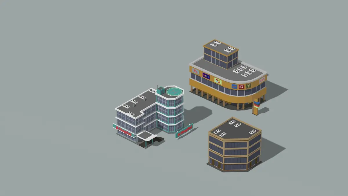 90 low-poly 3d models of very good quality. Arena, multi-storey buildings, shopping center, cinema, office buildings, police, hospital, cafe, Barber shop, bank, gas station, warehouse, hangar, monument, newspaper shop , bus stop, city passenger transport, cargo transport, tractor, cargo van, onboard truck, ambulance, police cars, taxis and cars of different models, as well as Billboard, fence, trees, Playground, lamppost, road signs and traffic lights
