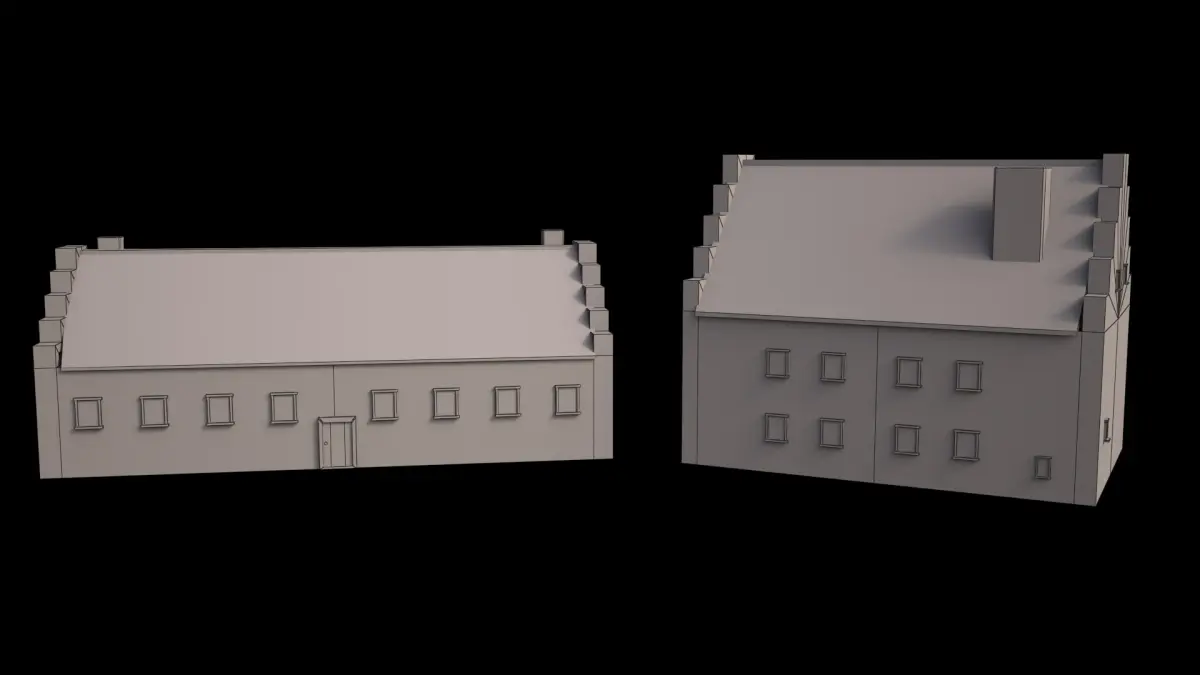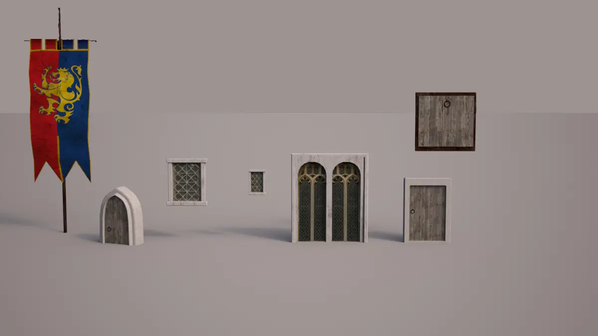 Contains: Houses (4 types), wall , main gate, Donjon (kings flat :-) ), stables, gallows, some enviroment (crates, barrels ...), well, adjustable windows and doors. flags .....