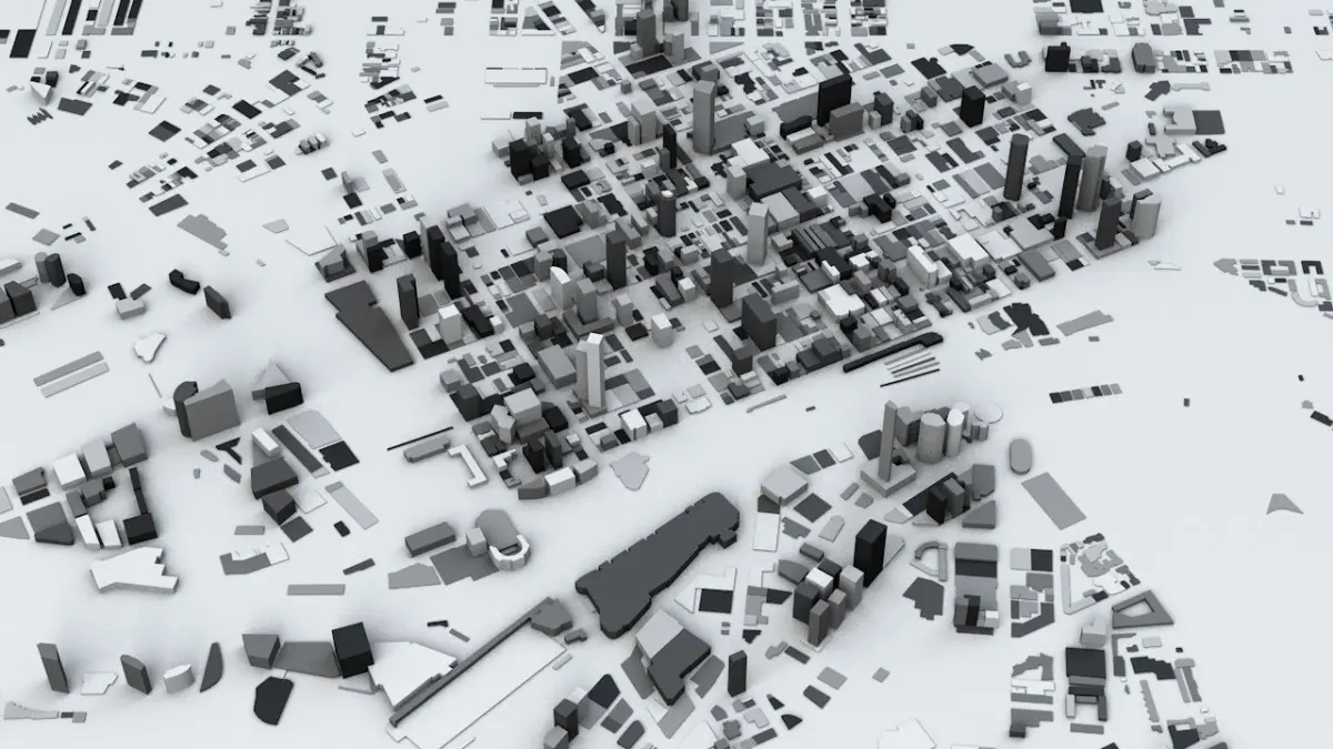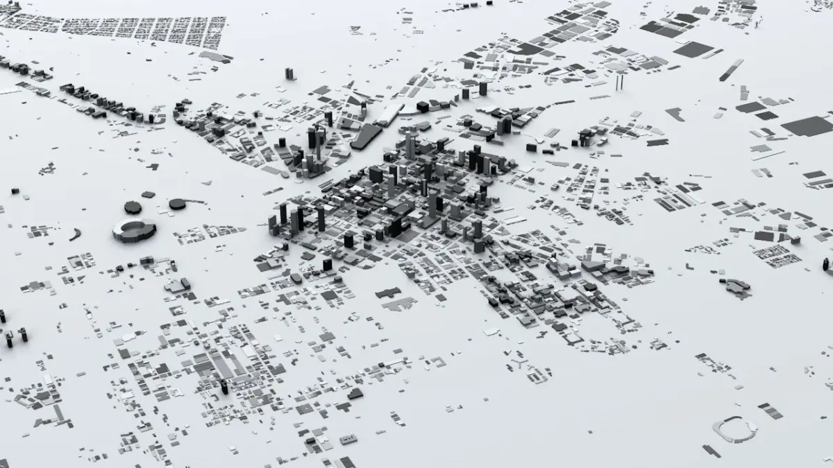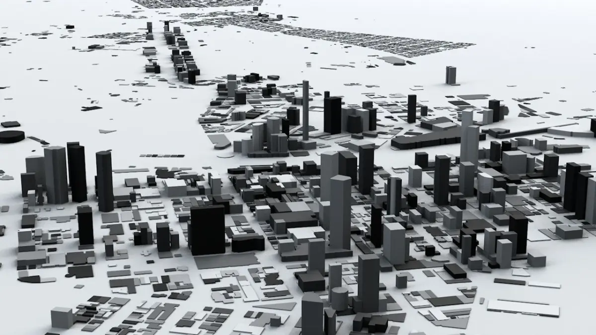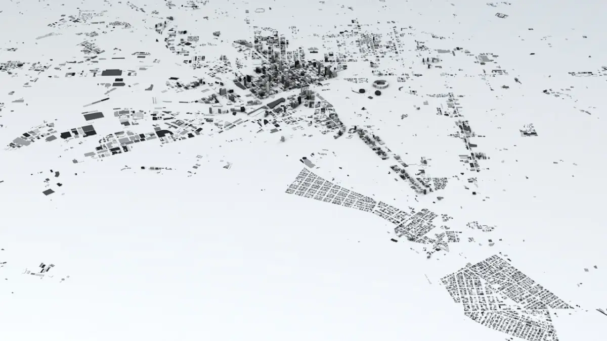 - the model is positioned on a flat surface (all buildings are on the “floor” - no elevation data included)