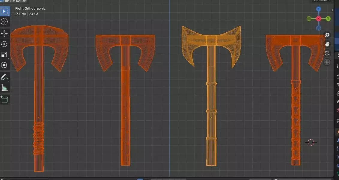 This high-quality 3D asset pack features a collection of four distinct, heavy-duty melee axes, meticulously designed with a blend of rugged tribal aesthetics and ornate craftsmanship. Ranging from primitive wood-bound designs to gold-inlaid ceremonial weapons, this set is perfect for fantasy, historical, or RPG environments.