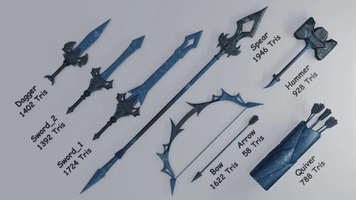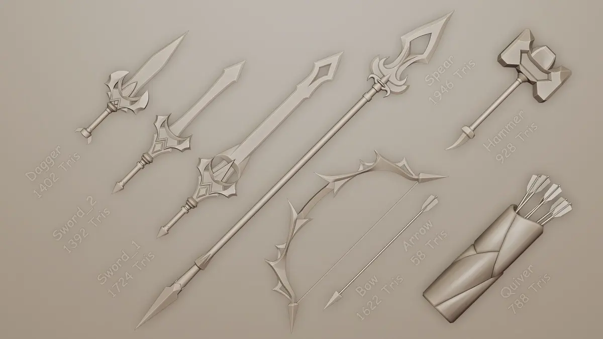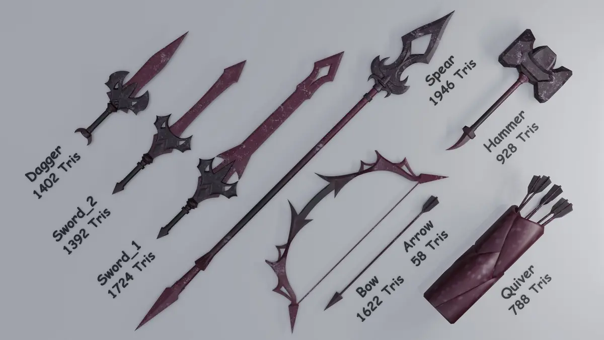 - Bow with Arrow and Quiver (Bow 1622 Tris) - (One Arrow 58 Tris) - (Quiver contain 7 Arrows, Total 788 Tris)