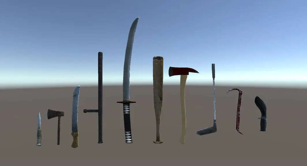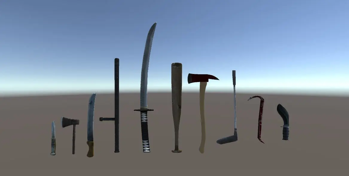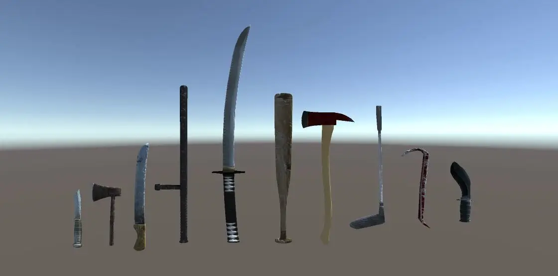 FBX format (LOW POLY)1 Axe verts 86 poly 79 tris 1642 Fire Axe verts 334 poly 330 tris 6503 Golf verts 305 poly 297 tris 5944 Katana verts 717 poly 655 tris 13005 Crowbar verts 220 poly 215 tris 4366 Machete verts 106 poly 103 tris 2047 Night Stick verts 1020 poly 1005 tris 20368 Bat verts 524 poly 510 tris 9989 Knife verts 109 poly 107 tris 21010 Kukri verts 218 poly 212 tris 418
