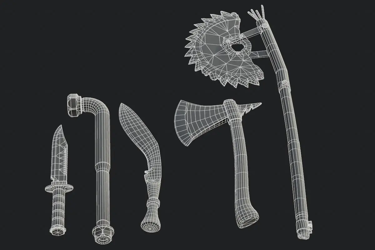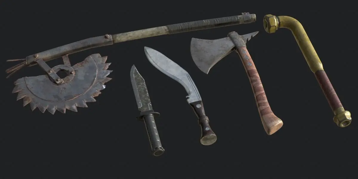 The pack includes five high quality melee weapons that have correct scale and are ready to export to game engines. The weapons are Kukri, Leadpipe, Sawtooth Axe, Survival Knife and Tomahawk.