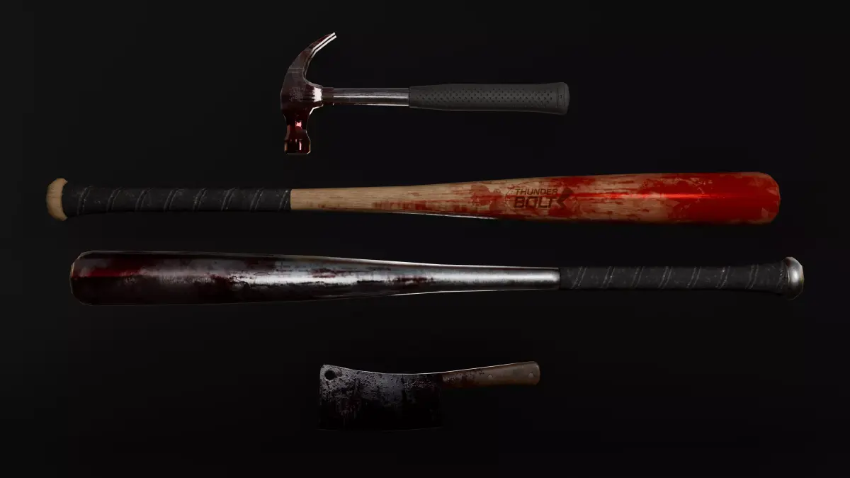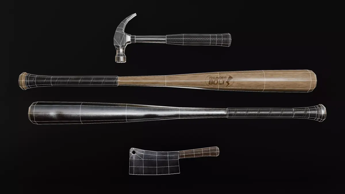 - 3 low-poly and game-ready melee weapons: baseball bat, clawhammer and a meat cleaver.