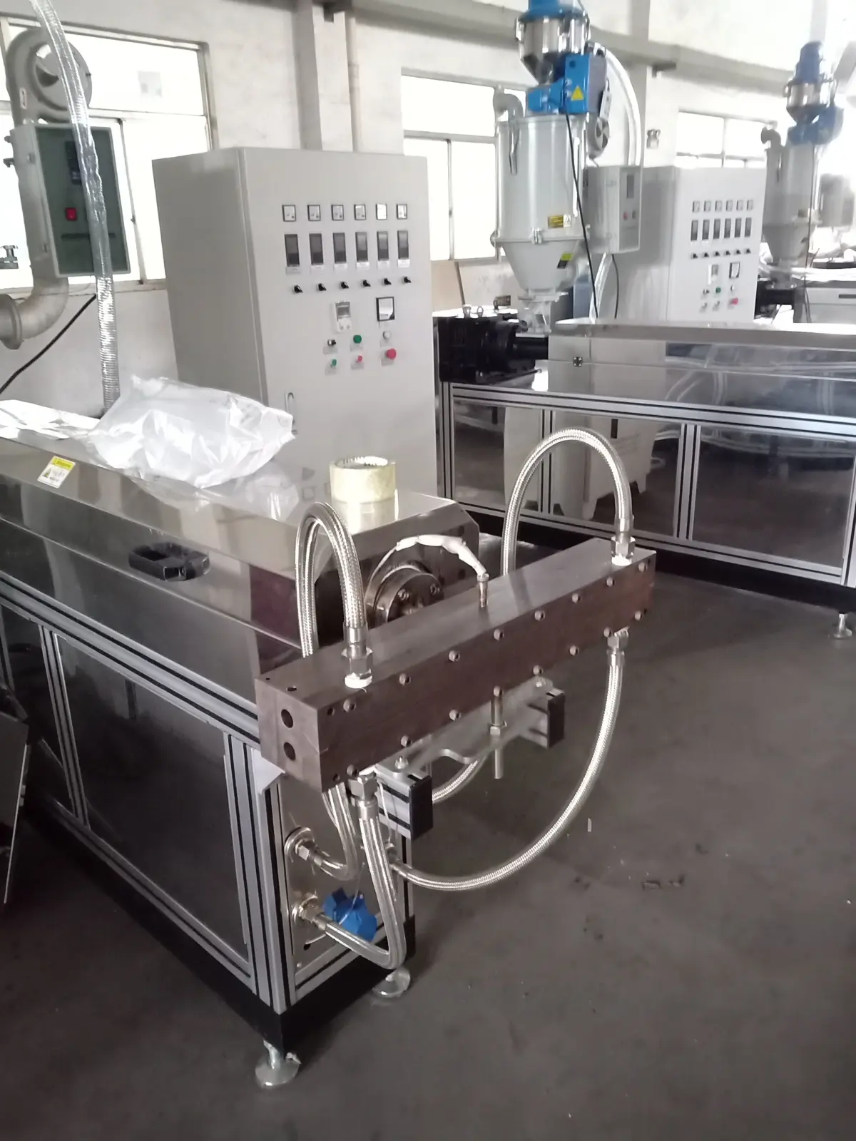Melt-blown fabric extrusion molding machine ,it is for producing Melt-blown fabric.Melt-blown fabric is masks at the core of material, mainly polypropylene melt-blown cloth as the main raw material, the fiber diameter can reach 1 ~ 5 micron gap structure more fluffy fold resistance is good, has the unique capillary structure of superfine fiber increase the number of fibers per unit area and surface area, so that the melt-blown fabric has good filterability shielding insulation and oil absorption