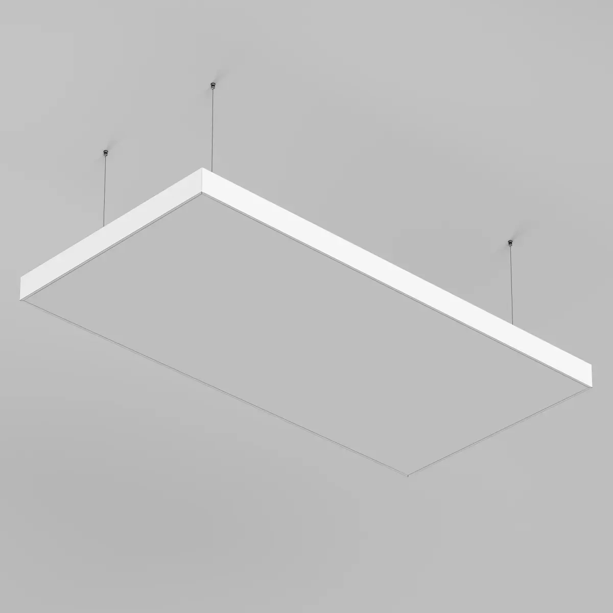 The series of functional large LED fixtures comes in square and rectangular shapes with an evenly illuminated surface, known as PL13. The light-diffusing membrane ensures uniform illumination without pixelation. Wide light distribution allows these fixtures to be used in spaces with low ceilings while maintaining a comfortable brightness level. The fixture is designed and manufactured in Russia. Suspension cables are purchased separately.