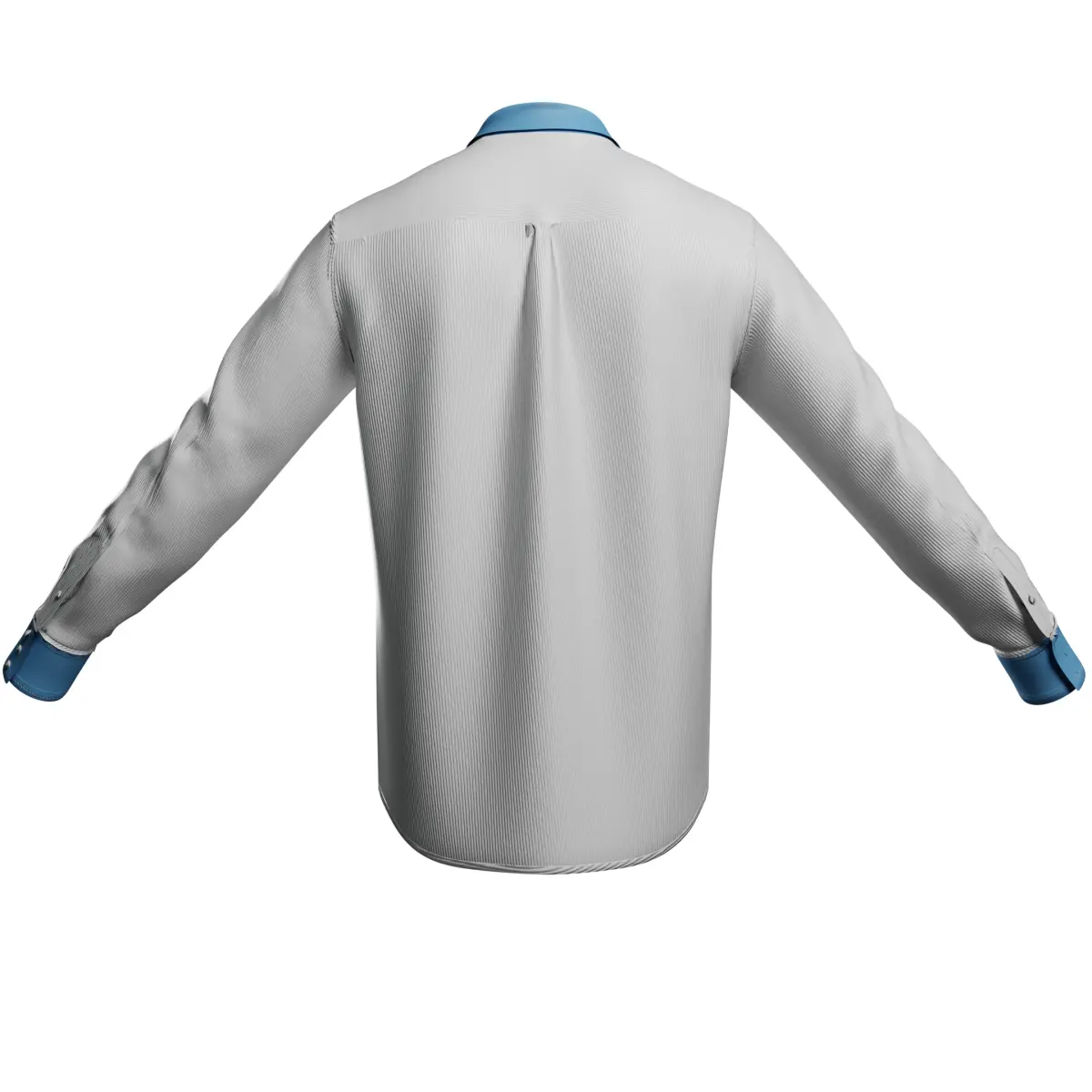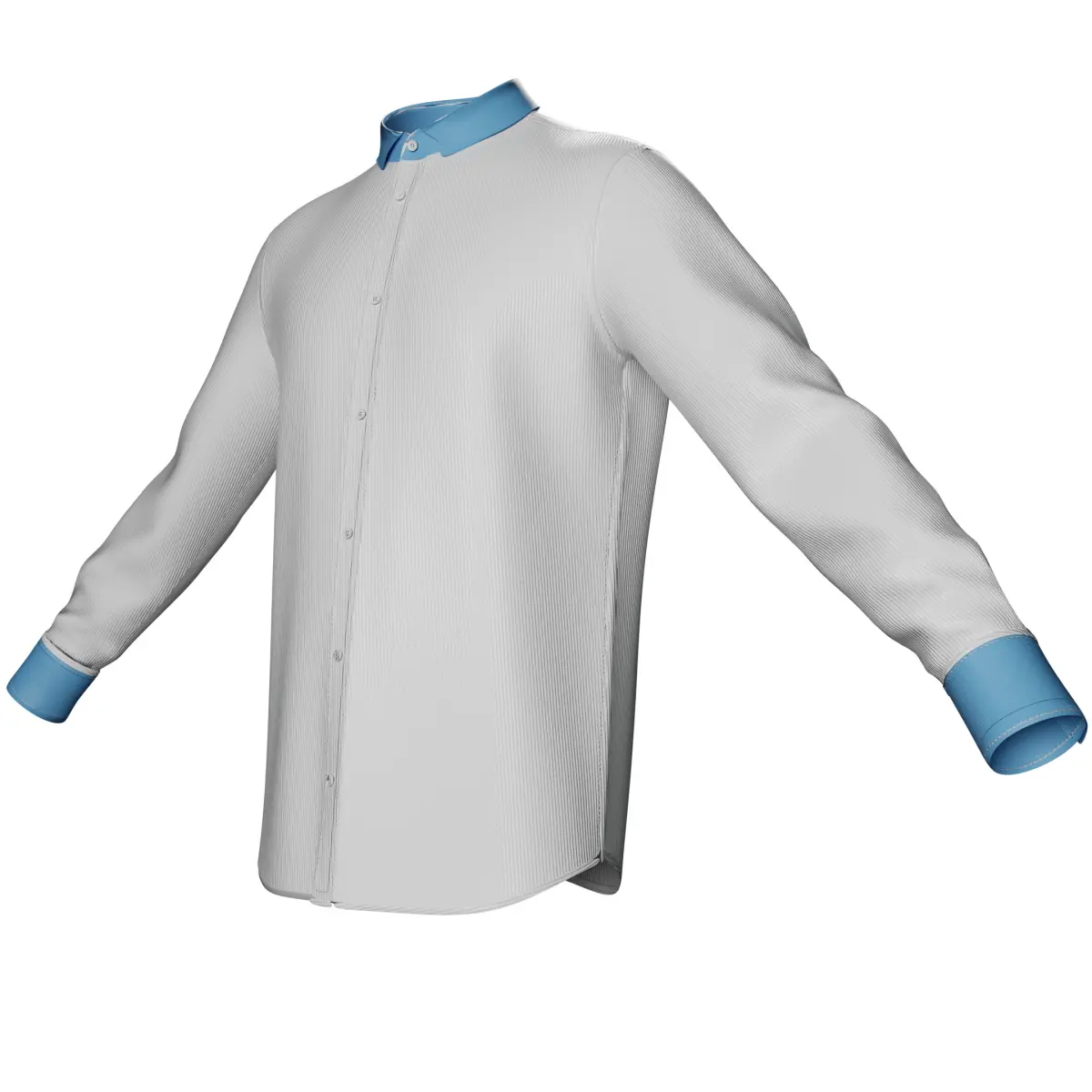 This premium 3D model showcases a classic long-sleeve button-up dress shirt featuring a clean white body with contrasting sky-blue collar and cuffs for a sophisticated and modern look. Ideal for formal scenes, office attire, or upscale character design.