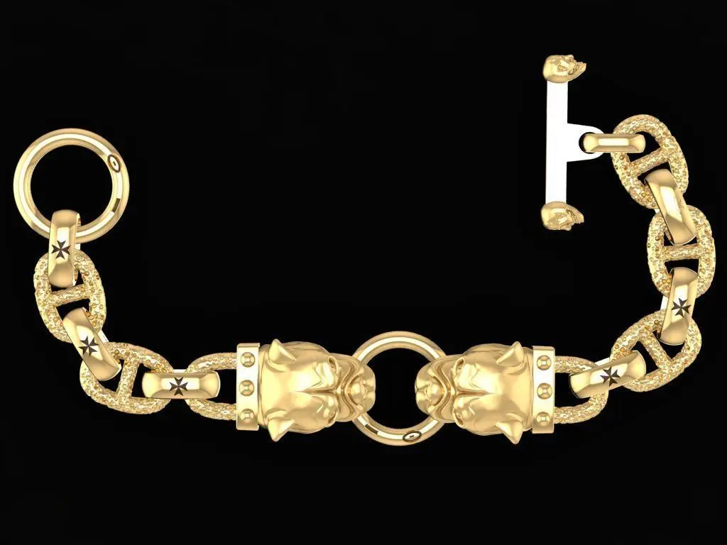 This men’s pitbull head chain bracelet 3D model showcases a bold and aggressive design featuring a detailed pitbull head gripping a heavy chain. The pitbull symbolizes strength, loyalty, protection, and fearlessness, making this bracelet ideal for men with a strong, independent personality.