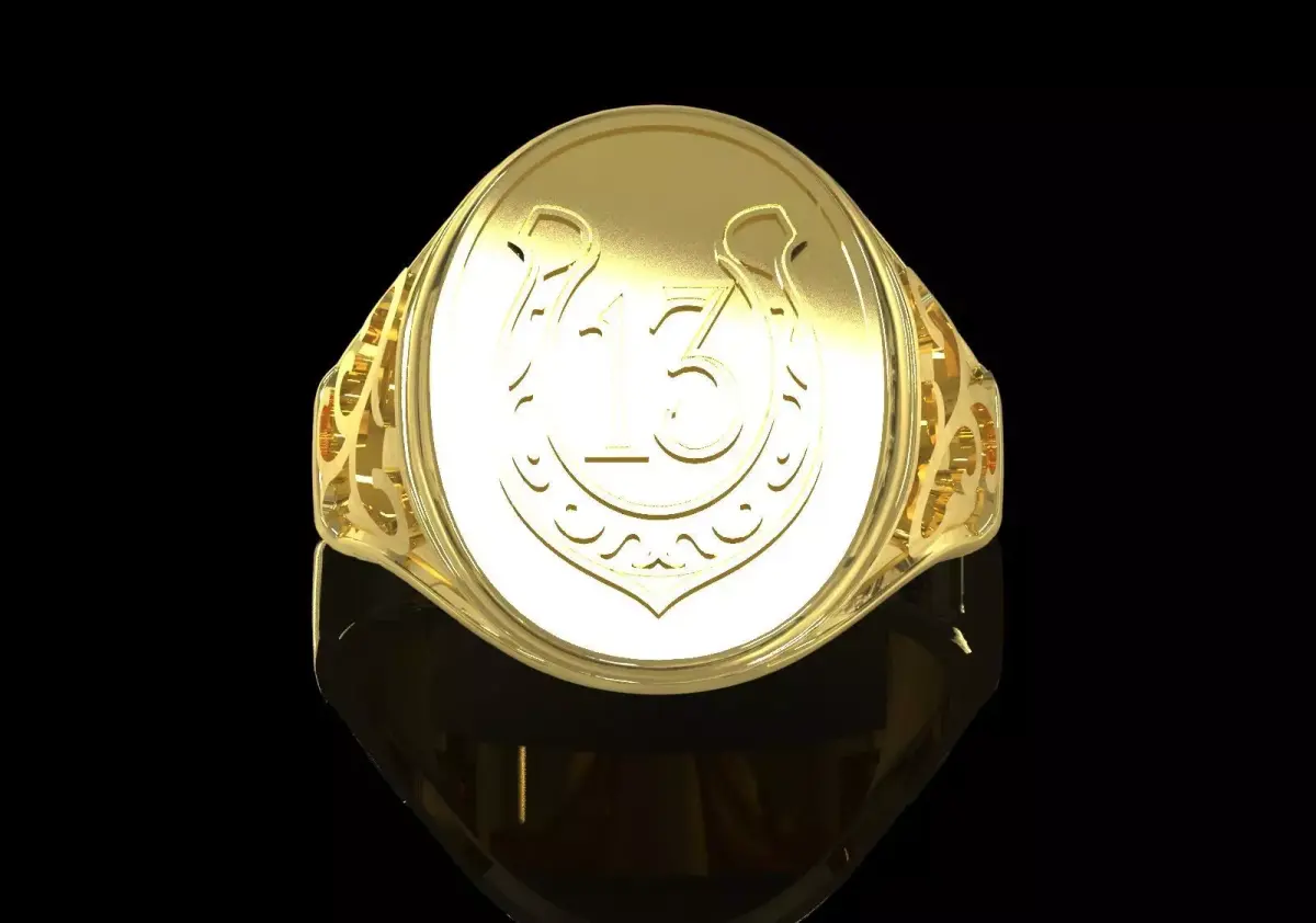 The MR0290 ring is a masculine, large and classic cavalry style signet ring, the upper surface of which is decorated with symbols of power, luck and the number 15. This piece is designed to show group identity, loyalty to a class or history and personal power.