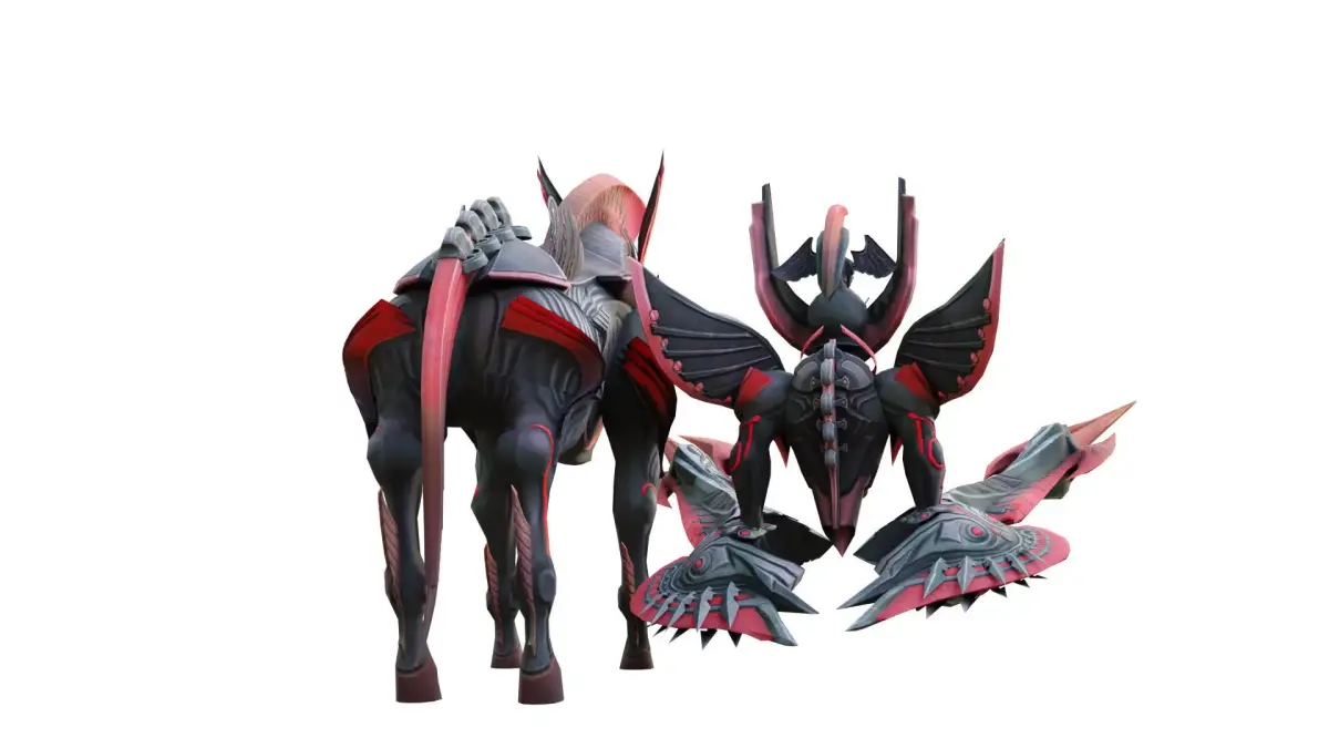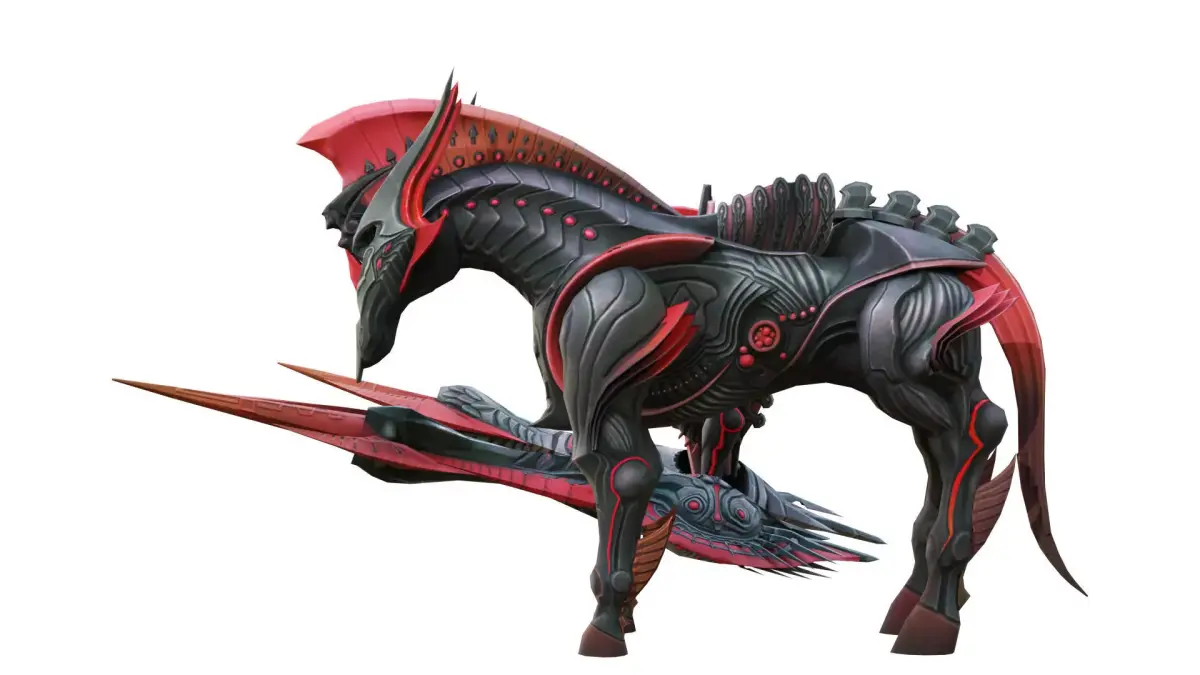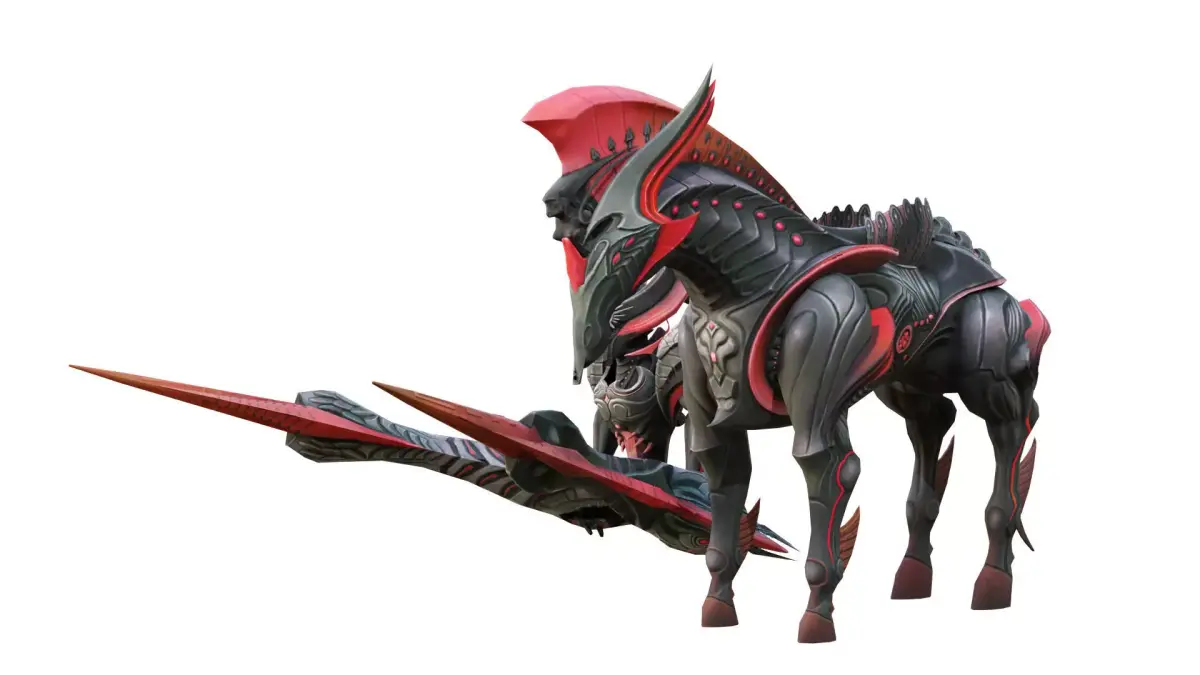 The image depicts a futuristic sci-fi armored warrior and a mechanical warhorse. The warrior is clad in heavy black-and-red armor, adorned with horned and ring-shaped headgear, and has a pair of massive, wing-like weapon structures extending from its back. The warhorse also features a black-and-red color scheme, with sharp horn-like protrusions and red accents on its head, creating an overall powerful and menacing aesthetic.