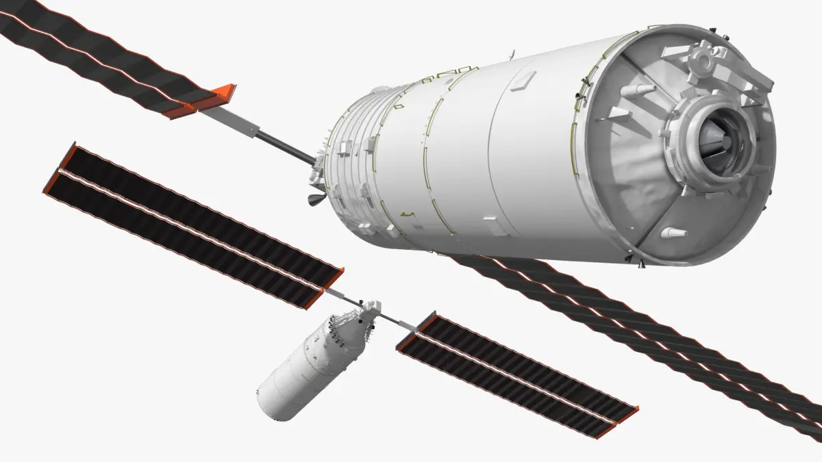 Mengtian Tiangong Side Module Deployed State White is a three-dimensional model of one of the laboratory modules attached to the Chinese Tiangong Space Station, shown with extended solar panels and external components.