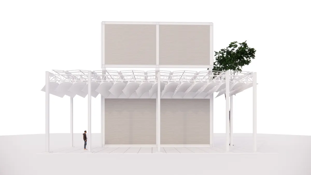 3dsmaxEach group of elements matching the layers in the skp file is now saved as a different layers (glass panels, leaves, posts, truss). For overwriting options and applying materials it makes it simpler to select objects. Identical elements have been made into instances.Background is plain whiteCameras are set up according to the renders, left with all the settingsLights also, a lightmix file (vray 5 needed to apply it) is attached to get back the same result if necessary. One texture made for the wood facade, in the package, material editor contains white paint, glass and wireframe, and a hdri that's also included.