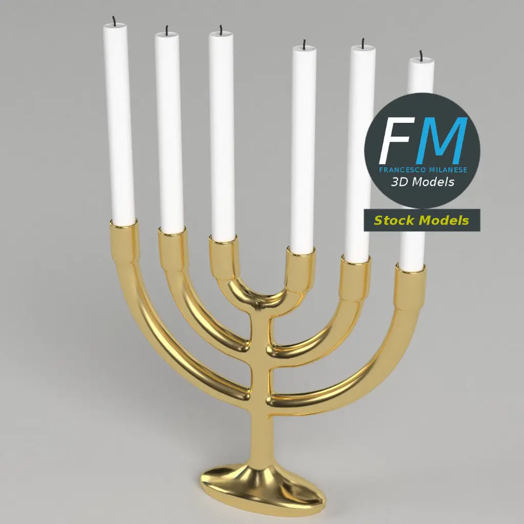 Menorah six-branches lampstand 3D Model. Production-ready 3D Model, with PBR materials, textures, non overlapping UV Layout map provided in the package.