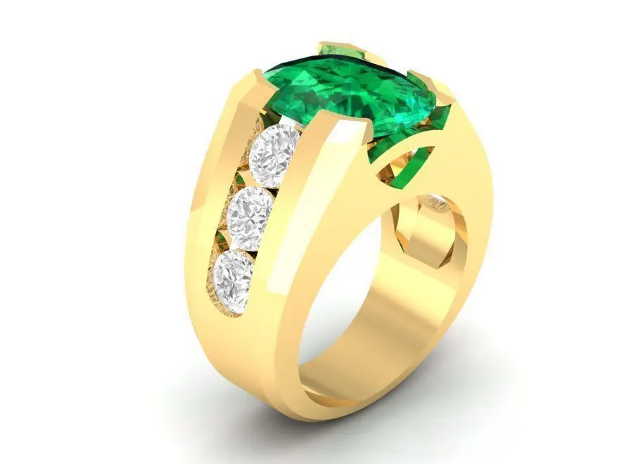 This mens ring features an oval cut emerald set at the center highlighted by rows of sparkling diamonds on both sides of the band. The wide structure and detailed settings give the ring a bold masculine look while still showing fine craftsmanship. The 3D model includes accurate dimensions gemstone sizes and weight information making it ready for jewelers CAD designers and manufacturers. It can be customized in yellow gold white gold or platinum depending on the project. With its combination of emerald and diamonds this ring is ideal for creating luxury mens jewelry suitable for daily wear special occasions or as a unique custom piece. The file is optimized for jewelry production 3D printing and rendering.