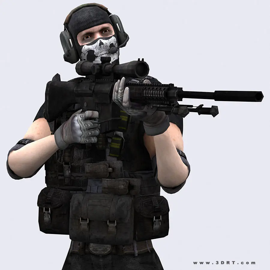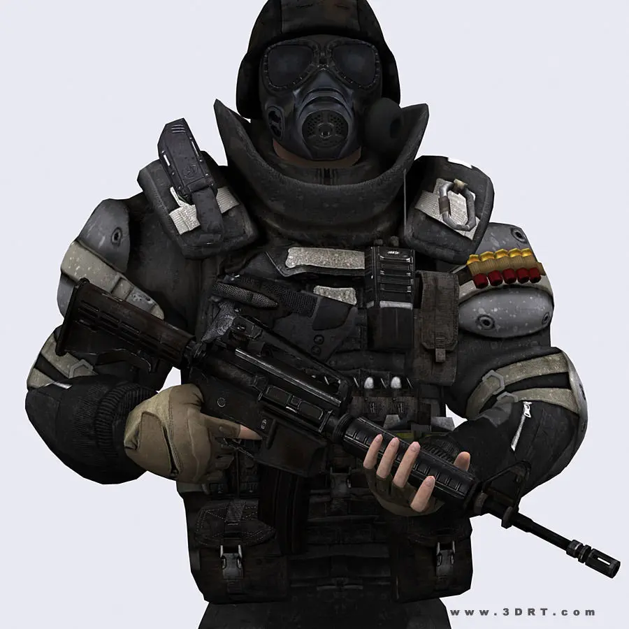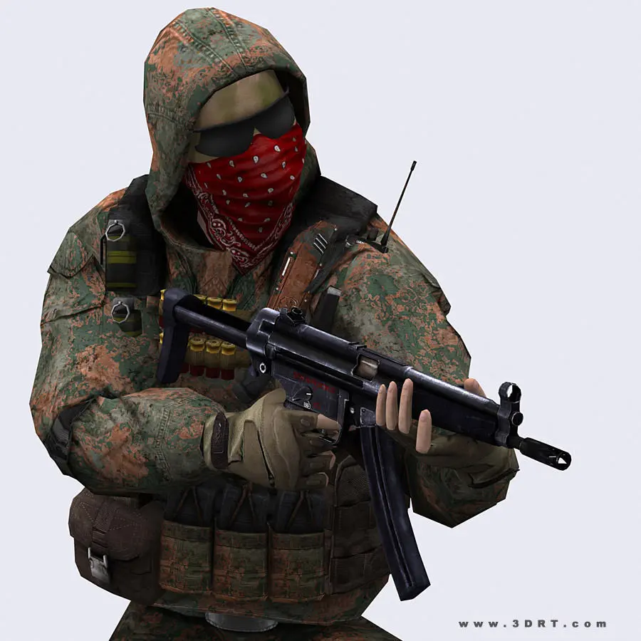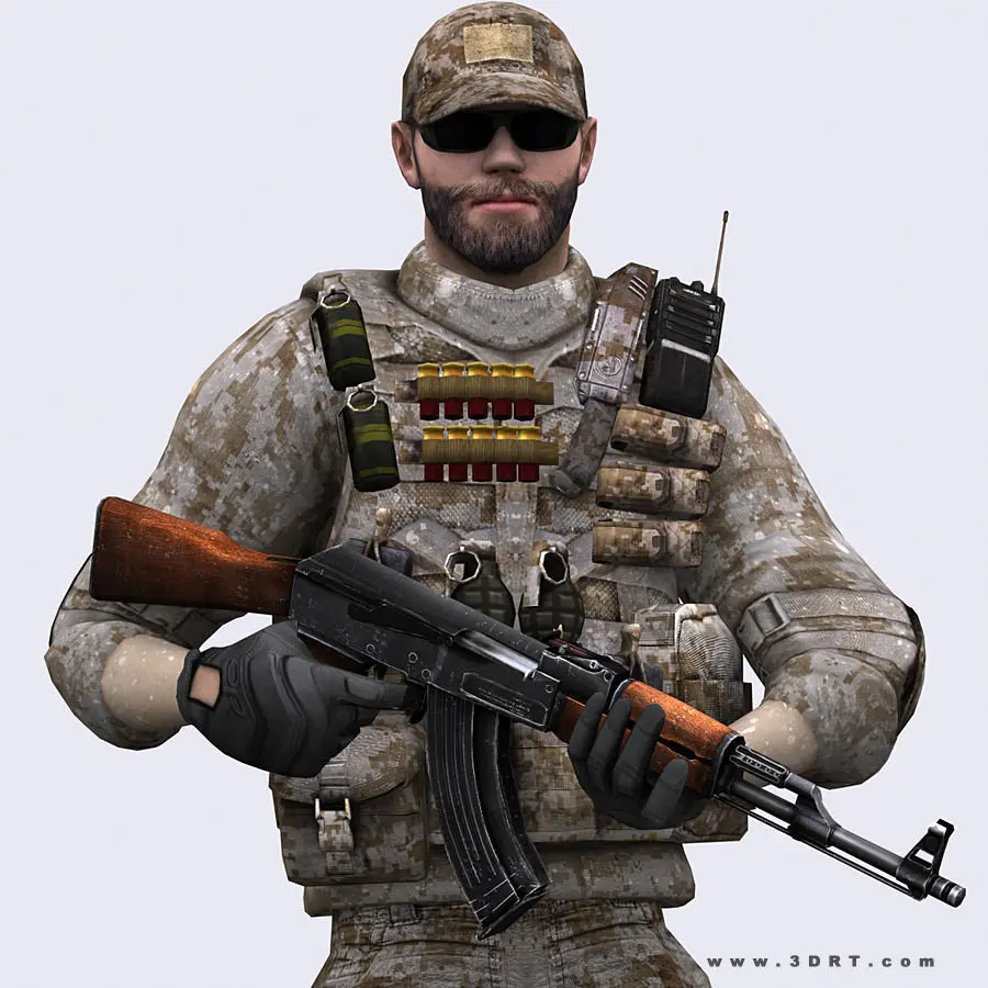 Merc rangers construction kit. Guns: AK47, M16, MP5K, MK11 sniper rifle, M9 pistol, knife. 10 heads x 10 textures 5 bodies x 10 textures 5 pants x 10 textures 5 shoes x 1 texture 5 hands x 1 texture 1 ammunition set - 5 variations x 10 textures Model with all the parts is delivered in a single file which are easily switched/managed within a 3D engine. Average triangles count for a fully equipped soldier ~ 5500