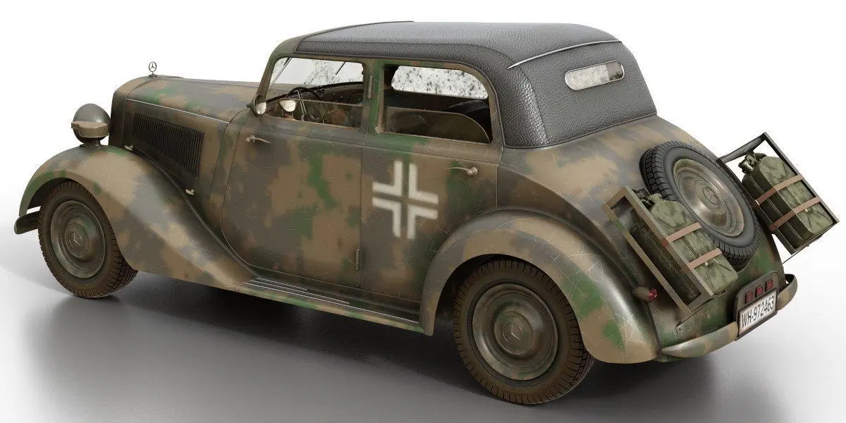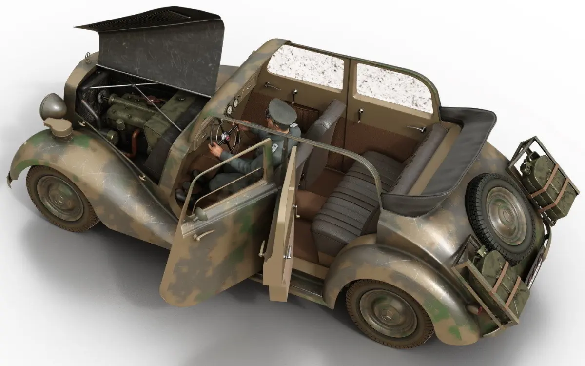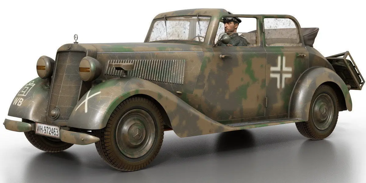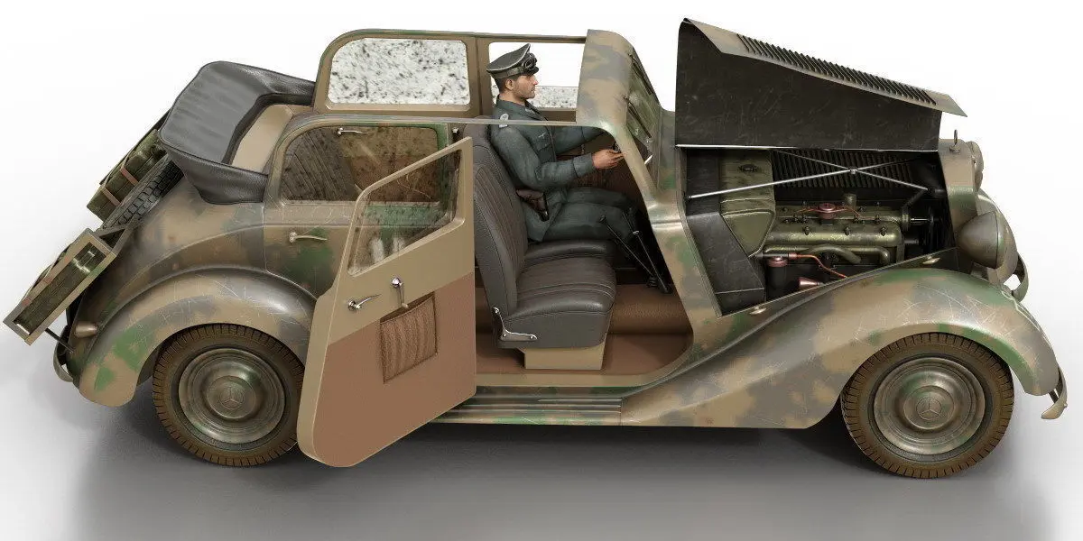 Mercedes-Benz 170V + driver, Wermacht variant, with two versions of the tent (folded and open). 3ds Max-2013, Corona (PBR mode off). On all objects UVW unvrap, in the stack of modifiers TS not rolled up.Mercedes-Benz 170V (internal index W136) - a series of cars of the German brand Mercedes-Benz, produced from early 1936 to 1955. This model has a version MB T170V Cabrio Saloon with an unfolded and folded tent.