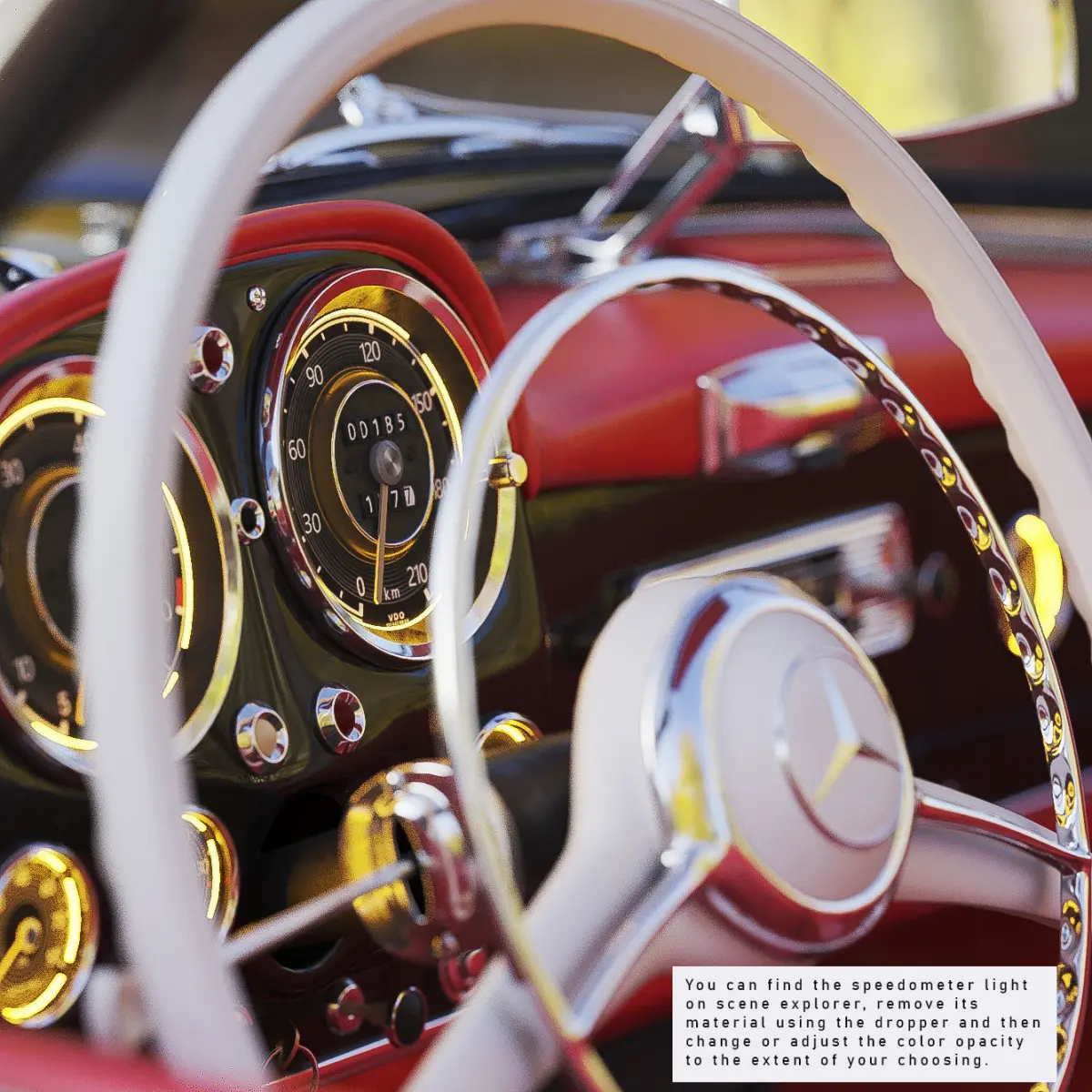 - You can find the speedometer light on scene explorer. Remove its material using the dropper and then change or adjust the color opacity to the extend of your choosing.