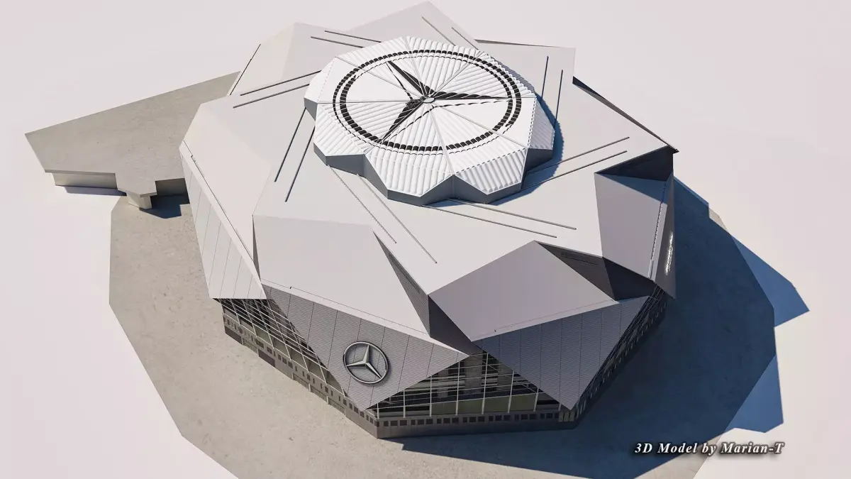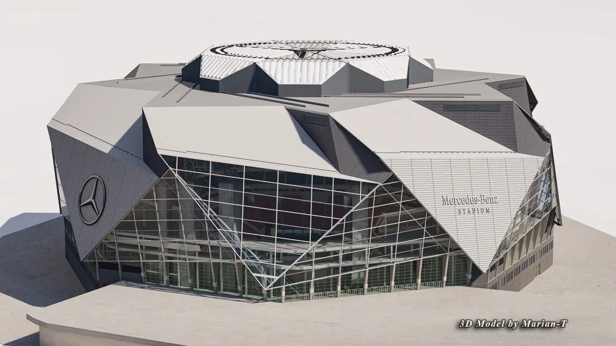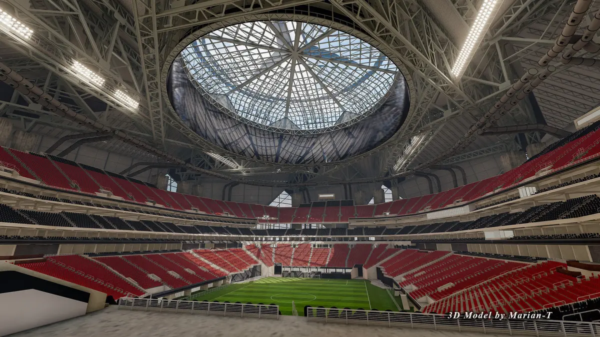 The 3D model is based on real world Mercedes-Benz Stadium 's photos references both inside and outside, created with approximate dimensions. .