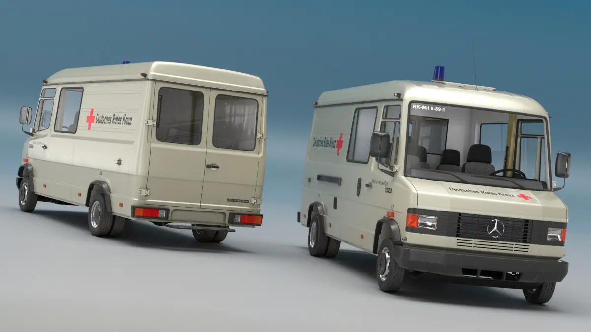 Iconic Mercedes-Benz 507 D van, known for its robust design and reliability. It features detailed exteriors with the Deutsche Rotes Kreuz insignia, showcasing its role in providing emergency services.
