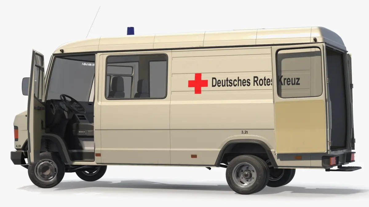 Mercedes Benz T2 507D Medical Transport Van Rigged for Maya is a three-dimensional model of vintage emergency response vehicle, originally used by the German Red Cross.
