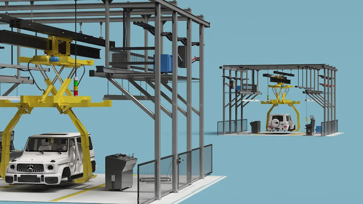For automotive manufacturing, vehicle assembly lines, industrial automation, production facility simulations, mechanical engineering, car manufacturing processes, technical training, factory layout design, and automotive industry visualizations.