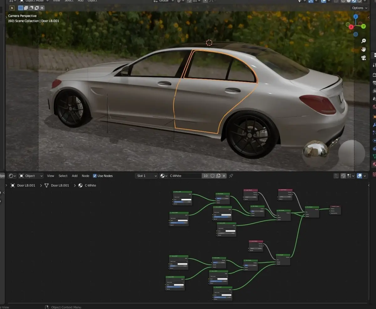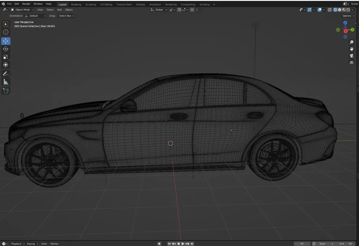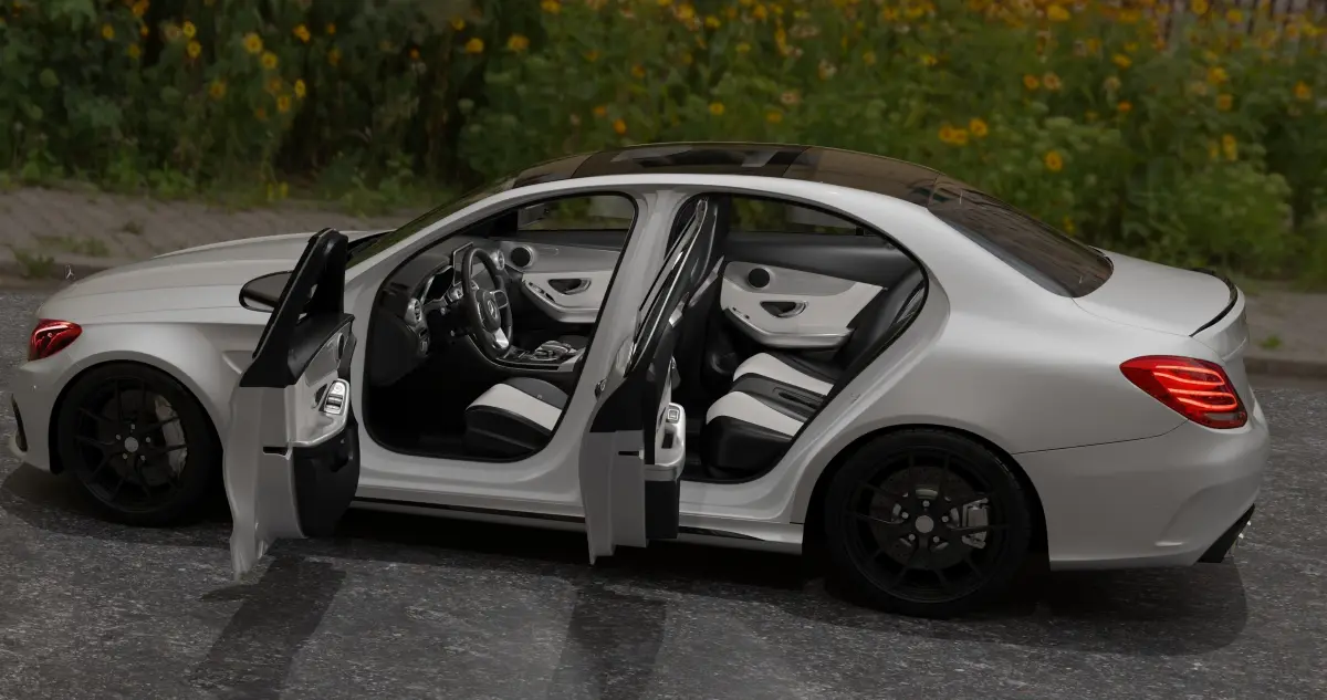Mercedes C63 modeling from the inside and outside in detail in black and white, suitable for cinematic scenes. The car was completely modeled on the Blender program, and the textures were also made on the same Blender program