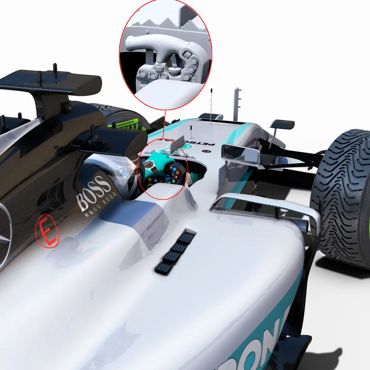 This is a 3D low poly model ,it was designed to provide a high definition in a low poly. Standard low-poly mesh with specific poly count. It`s the most accurate and realistic Mercedes W07 Hybrid of the market.It has all of details of W07 Hybrid model. Rigged in the maya version. This is a recreation of Mercedes W07 model,it can suffer modification over the season.Included all types os wheels, Lewis Hamilton and Nico Rosberg, theirs helmets and the steering wheel.The model is completely ready for use visualization in maya. For low poly model simply press 1 and for the high resolution press 3. In Cinema4d go to function menu and subdivide. In 3dmax meshsmoothIn the low poly: Poly count : 218560 Vertex count : 229216In the high poly: Poly count : 3910588Vertex count : 3951931Textures included. Each texture is in jpg format and have a 4K texture resolution for high quality It has three UV textures, one for the car , other for the tires and the last one for the driver. It has color textures, specular textures, displacement textures,bump textures.The files are obj, fbx, mb ,c4d and 3DS.Included 7 different poses of each driver.In formats c4d, 3ds, obj and fbx model exported to standard materials (textures), not contain mental ray shaders. files with the model does not contain extraneous or hidden objects (lights, cameras, etc.) Included rigging and constrains, blend shapes and driven keys only in the maya format.In the maya format you can easily change the wheels, the pilot and the DRS(open and close).original file format maya render in linear sRGB
