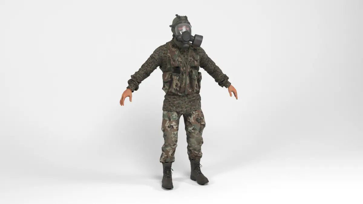 3D model of a mercenary with gas mask, military clothing and weapon. The model includes bones and several animations. Model ideal to be used in games, advertising and video production. Low-poly models to be used easily in any project.
