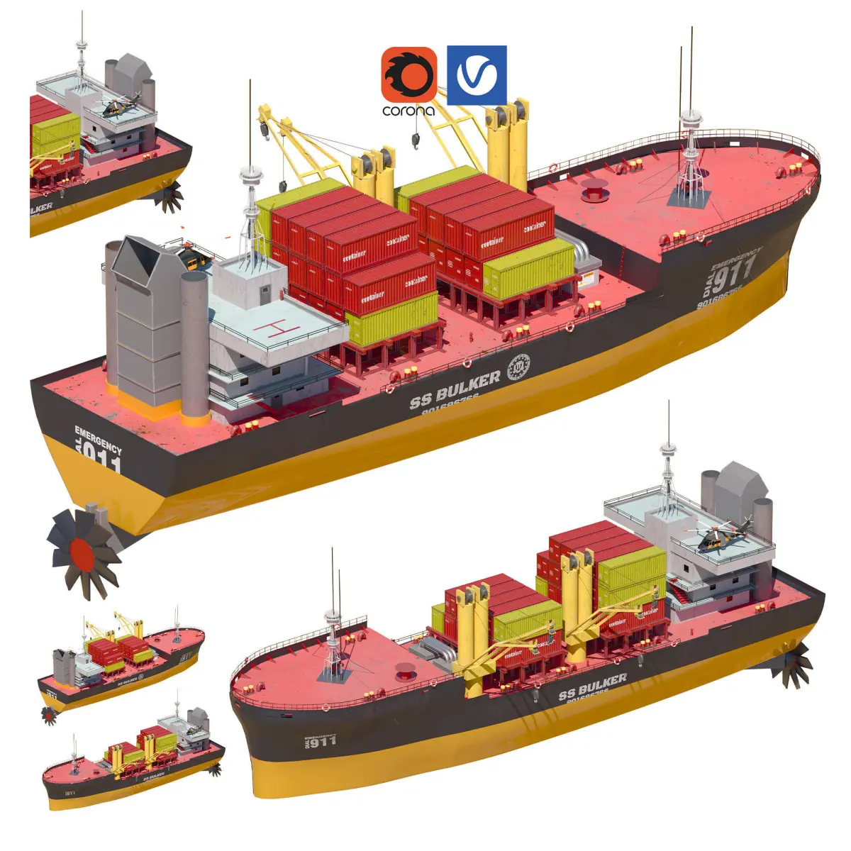 Product Name:merchant shipOutput version: 3D Max 2016has helicopter , crande ,containerPolygon above:235128Vertex: 270729Lowe Poly:47921Vertex: 49213Formats: 3D Max 2016 and OBJRendering: vray5.2 ,corona 8.1