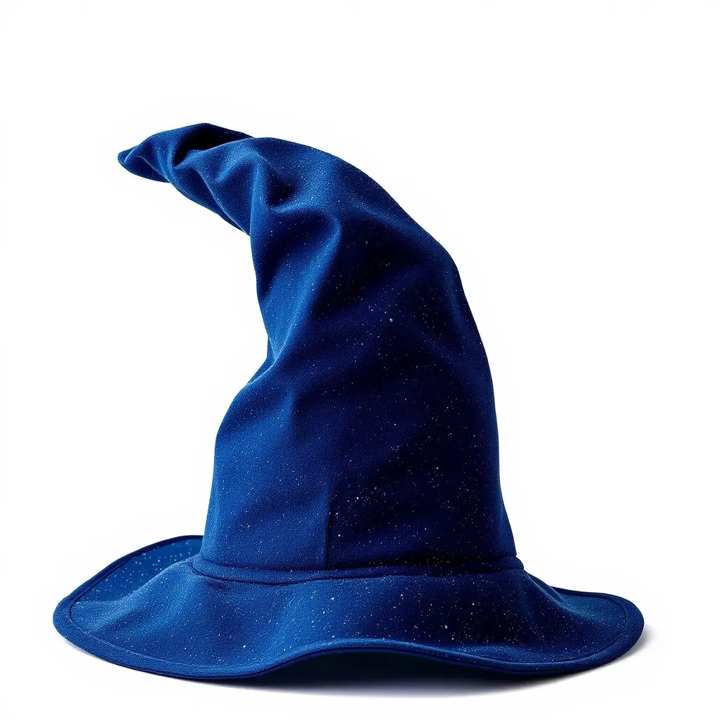 This Merlin-inspired wizard's hat, featuring a royal blue hue speckled with luminous stars and nebulae, is perfect for magical and fantasy-themed projects. Its whimsical silhouette and dramatic peak add charm and mystique.