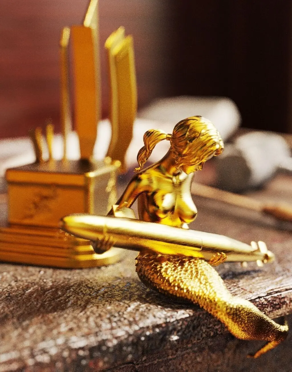 Français:Plongez dans les profondeurs de l'océan avec cette sculpture 3D. Un croisement fascinant entre la fantaisie marine et l'innovation technique, cette pièce dépeint une sirène, créature élégante et mystérieuse, en train de transporter un engin des abysses. C'est une représentation surréaliste qui interpelle l'imaginaire, idéale pour ceux qui sont attirés par les mystères sous-marins et les légendes nautiques.