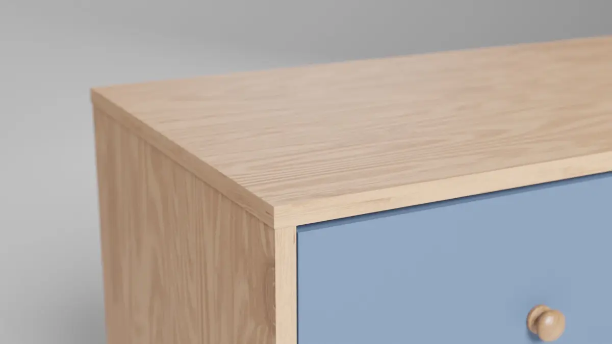 IntroductionA chest of drawers with decorative pine wood knobs, for a master suite as well as the living room or home study. Features 3 wide and deep drawers with matt blue and white fronts. The chest is a complementary accent piece for Scandinavian, modern and natural home decors.