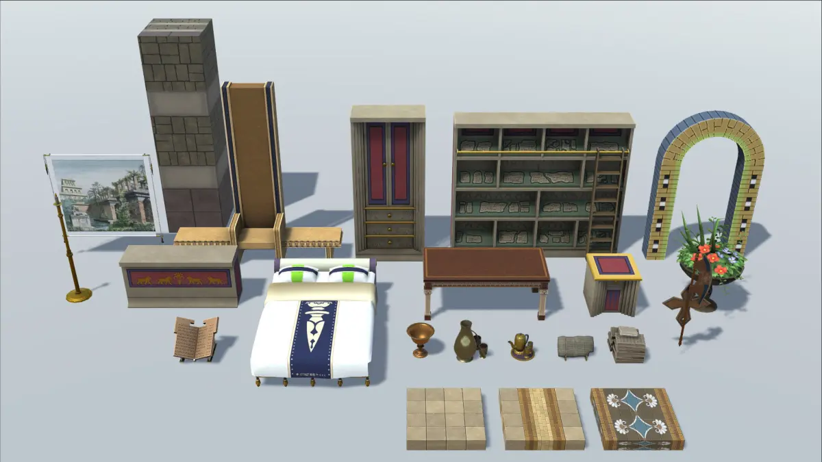 A set about the topic of Babylon based on fictional furniture’s ands clutter objects. It contains 18 objects, 3 floor material and one wall material