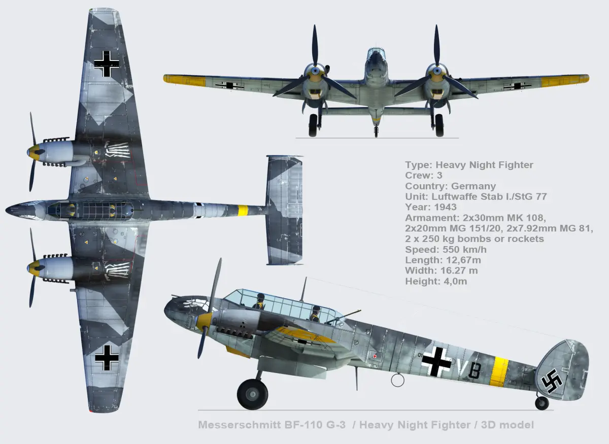 This particular aircraft was a Bf 110 G-3 of Stab/StG 77, which was handed over to Stab/Nahaufklärungsgruppe 1 in March 1943. This is where this 110 served in the Southern sector of Russian Front.The 3d model was designed according to a real aircraft base: Messerschmitt BF 110G-3 Western Front 1943.
