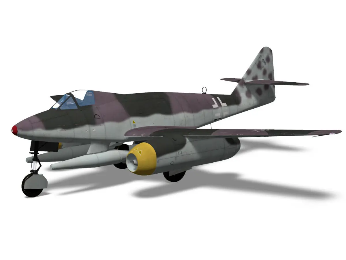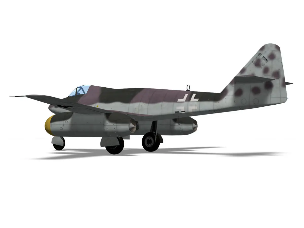 The Me 262 was a jet fighter operated by the Luftwaffe at the end of WW2.The Schnellbomber 1a is a fast bomber plan with the cockpit moved to the nose.The model's landing gear is divided into flight and landing state parts.