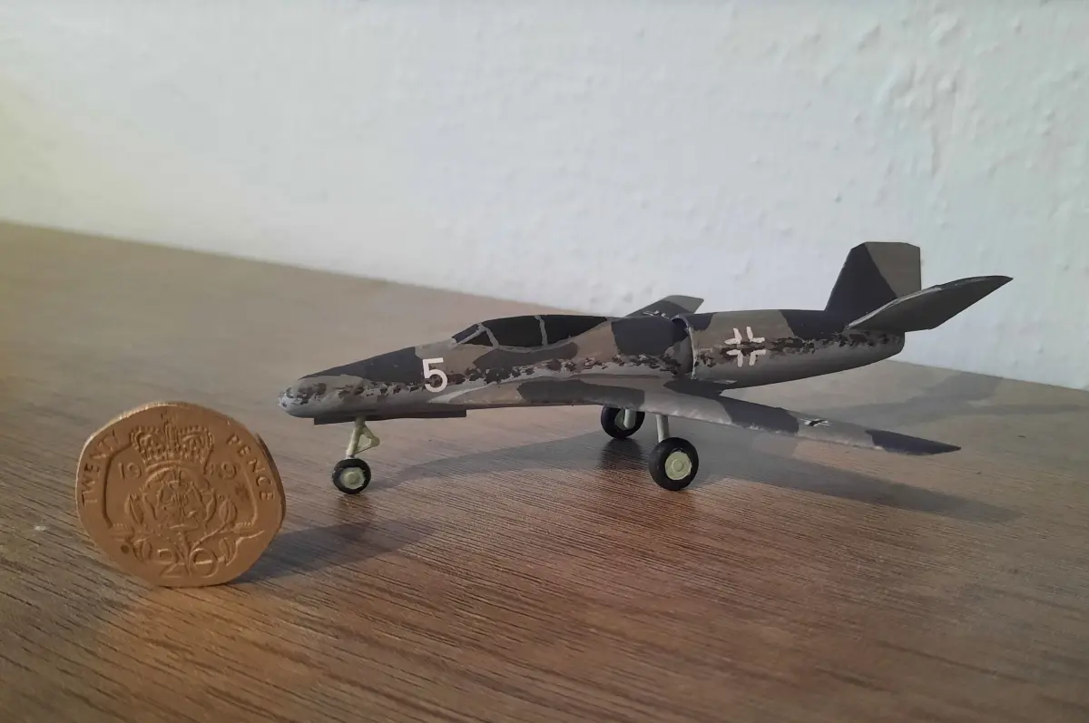 This is a model of the Messerschmitt P1110 jet fighter, a WW2 design that never left the drawing board. Note that the design was for a very small aircraft with a wingspan of just 6.65 metres (compare to 11.23m for the Spitfire MK V).