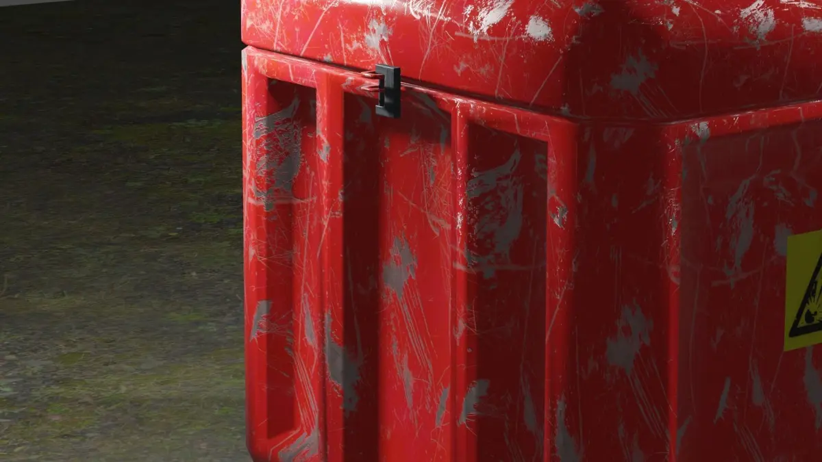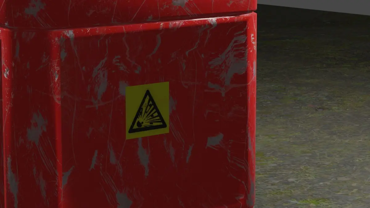 Metal box with a lock and a danger sign. Metallic red with peeled paint. On one of the sides there is a sign of danger and explosive substances. The lock covers the drawer and its contents.Low-poly, 3D, game ready.Polygons - 4511Vertices - 4562