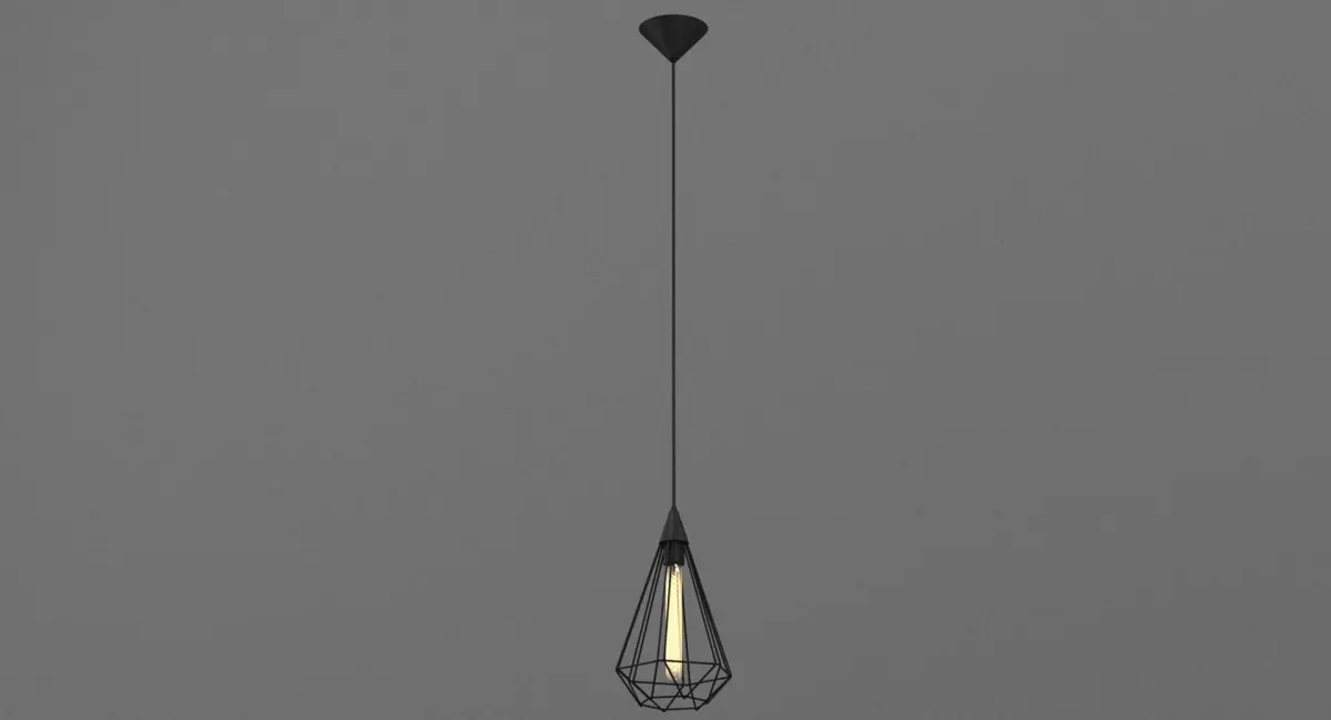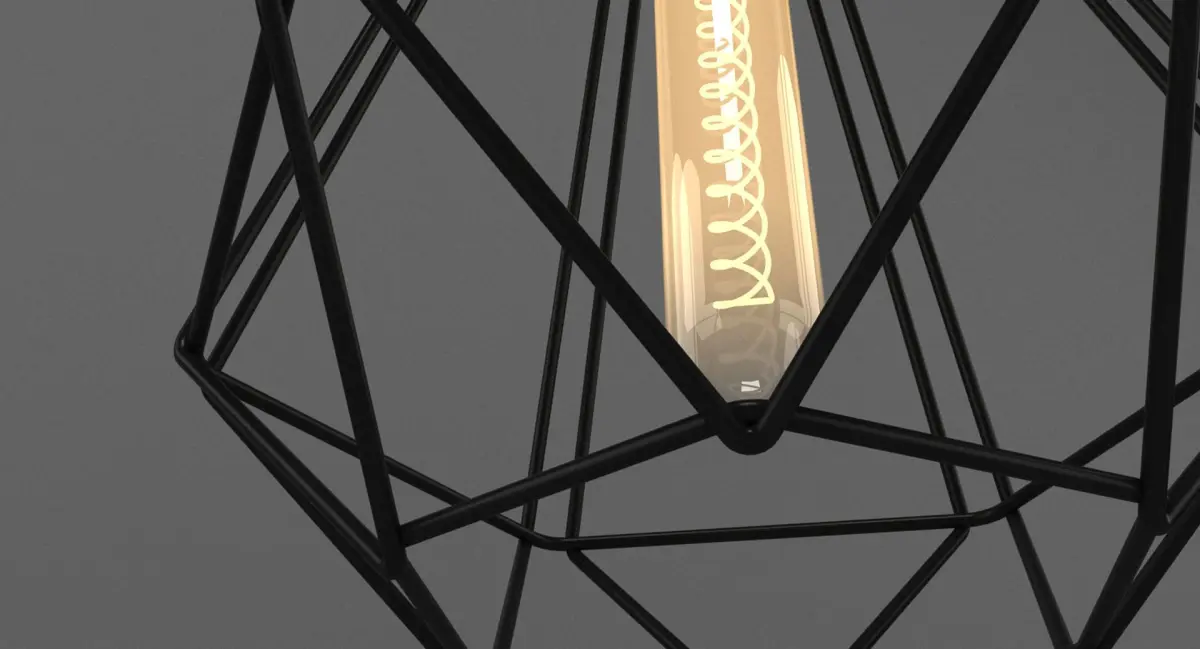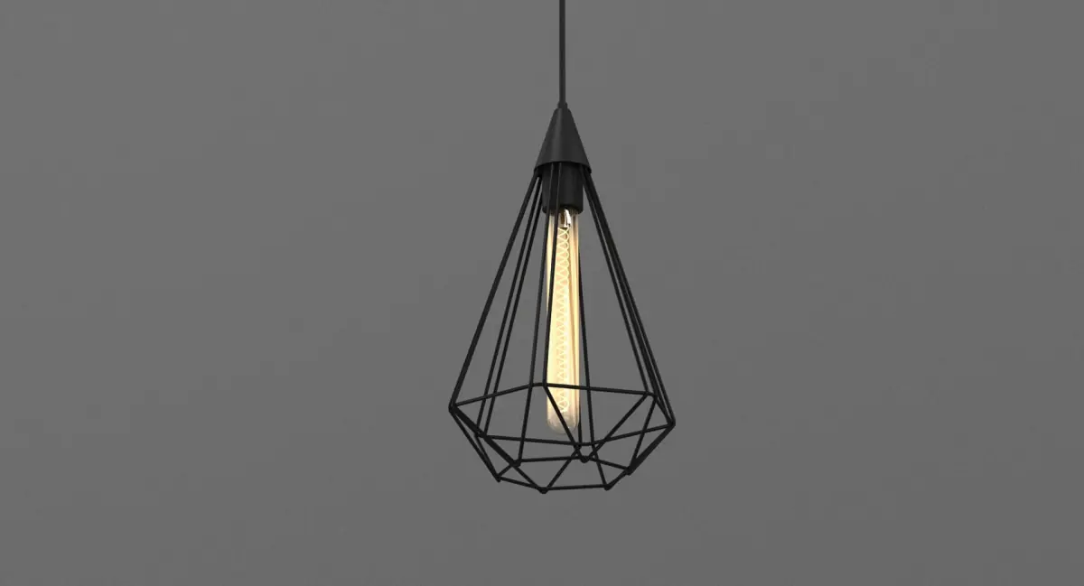 A DETAILED 3D MODEL OF A METAL CAGE HANGING LAMP;