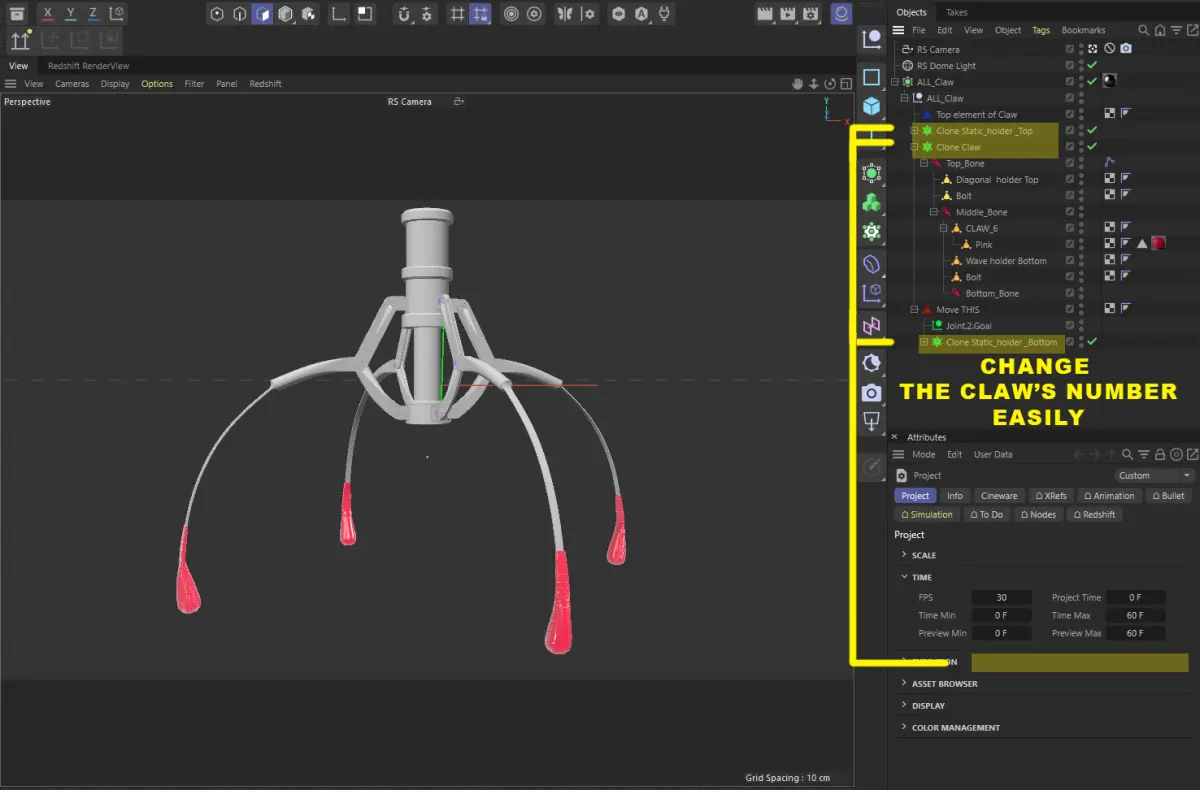 3D Model of Metal Claw 13 with RiggingThe animation for the claw is set up using a rig, allowing you to control it easily. You only need to move the highlighted element on the screen, and all other parts will move automatically in response to rigging.