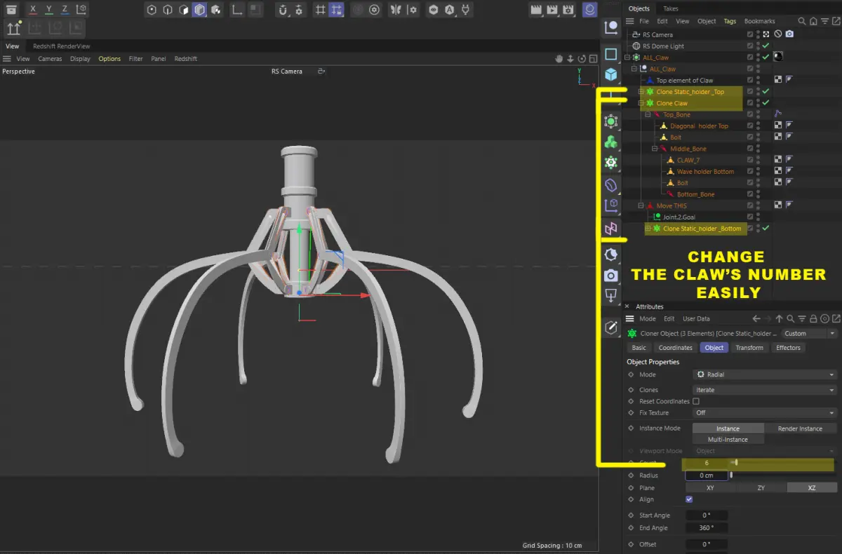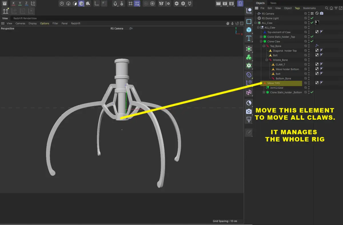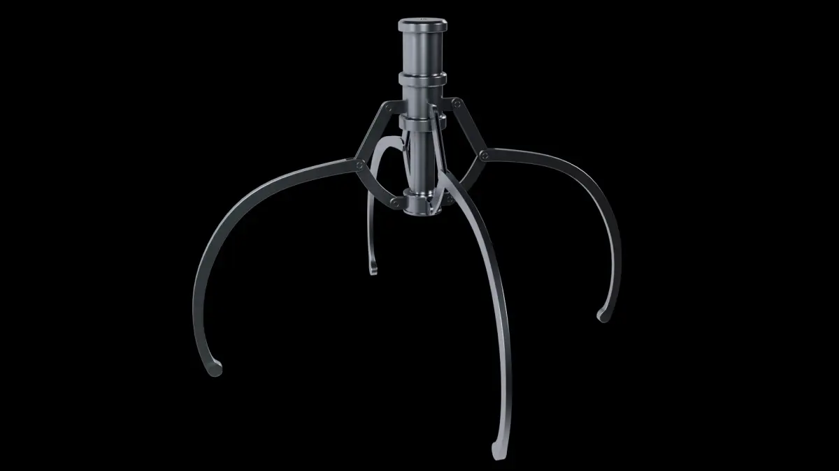 3D Model of Metal Claw 14 with RiggingThe animation for the claw is set up using a rig, allowing you to control it easily. You only need to move the highlighted element on the screen, and all other parts will move automatically in response to rigging.